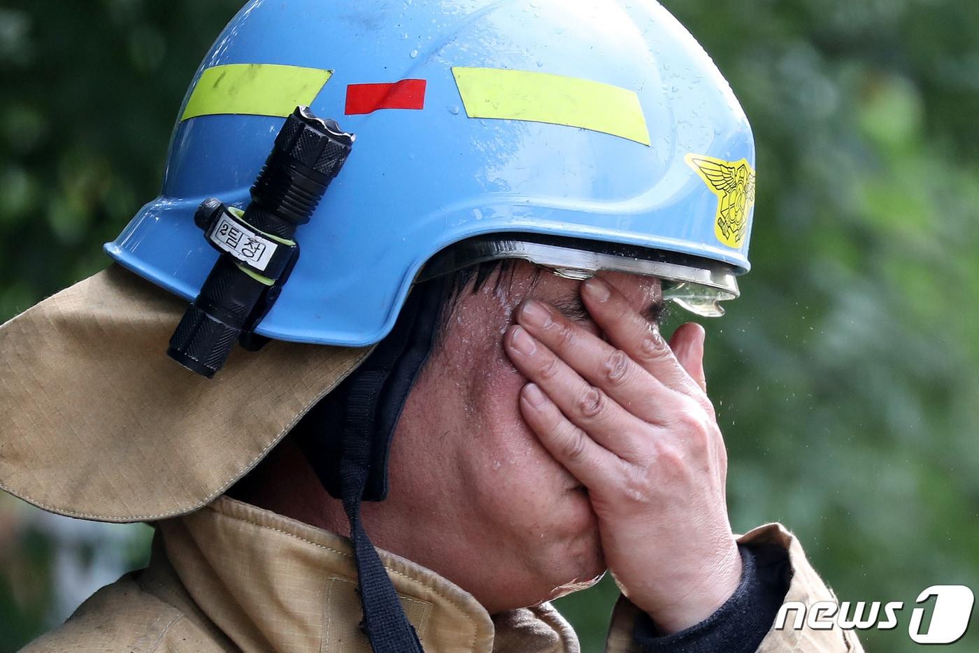 6일 오후 경기도 안성시 양성면의 한 종이상자 제조공장에서 화재가 발생해 한 소방대원이 화재를 진압하던 중 땀을 닦고 있다. 이 불로 진화작업을 벌이던 안성소방서 소속 소방관 1명이 숨지고 또 다른 소방관 1명과 근로자 등 7명이 부상했다. 2019.8.6/뉴스1 ⓒ News1 조태형 기자