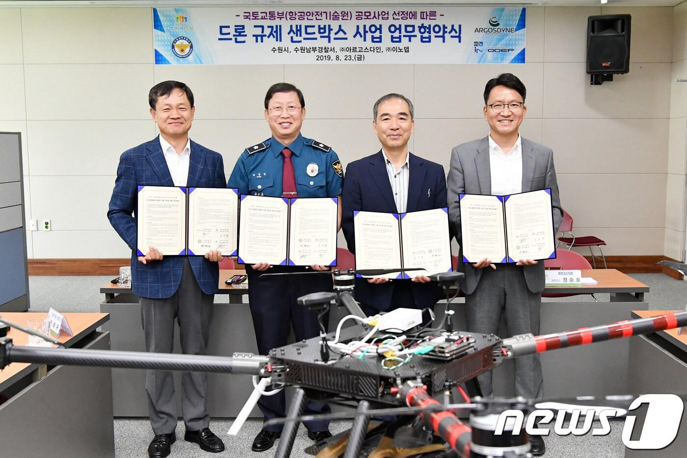 (왼쪽부터) 이동수 ㈜이노뎁 부사장, 박형길 수원 남부경찰서장, 조무영 수원시 제2부시장, 정승호 ㈜아르고스다인 대표이사가 ‘2019 드론규제 샌드박스 사업 업무협약’을 체결하고 다함께 기념촬영을 하고 있다. (수원시 제공)ⓒ 뉴스1
