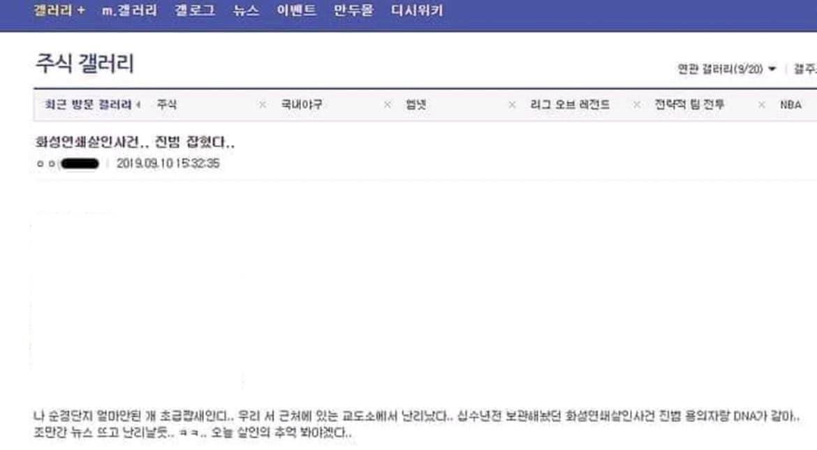 현직 순경 자처한 네티즌 지난 10일 유명 커뮤니티에 글 올려지난 10일 국내 유명 인터넷 커뮤니티에 자신을 현직 순경이라고 밝힌 네티즌이 '화성연쇄살인 진범이 잡혔다'는 글을 올려 일파만파 번지고 있다. ⓒ 뉴스1ⓒ News1 김일환 디자이너이상휼 기자 포천시, 행안부 재정분석 개선도 '최우수 지자체' 선정배우 송지효, 의정부교도소 '명예 교도관' 위촉