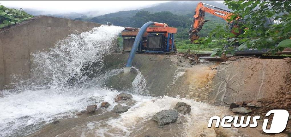 29일 내린 집중호우로 경북 청도군 내리리 대능저수지 만수위가 가까워지자 청도군이 선제적 피해 예방을 위해 물넘이를 깨 수위를 조절하고 양수기를 동원해 물을 퍼내고 있다. 7월 한달간 청도군에는 487mm의 비가 내렸다 (청도군 제공)2020.7.29/뉴스1 ⓒ News1 정우용 기자김평석 기자 경기 광주시, '주거복지대전'서 대통령 표창…전국 최우수용인FC, 측면 강화 김한길 FA 영입…"전술 이해도 뛰어나"