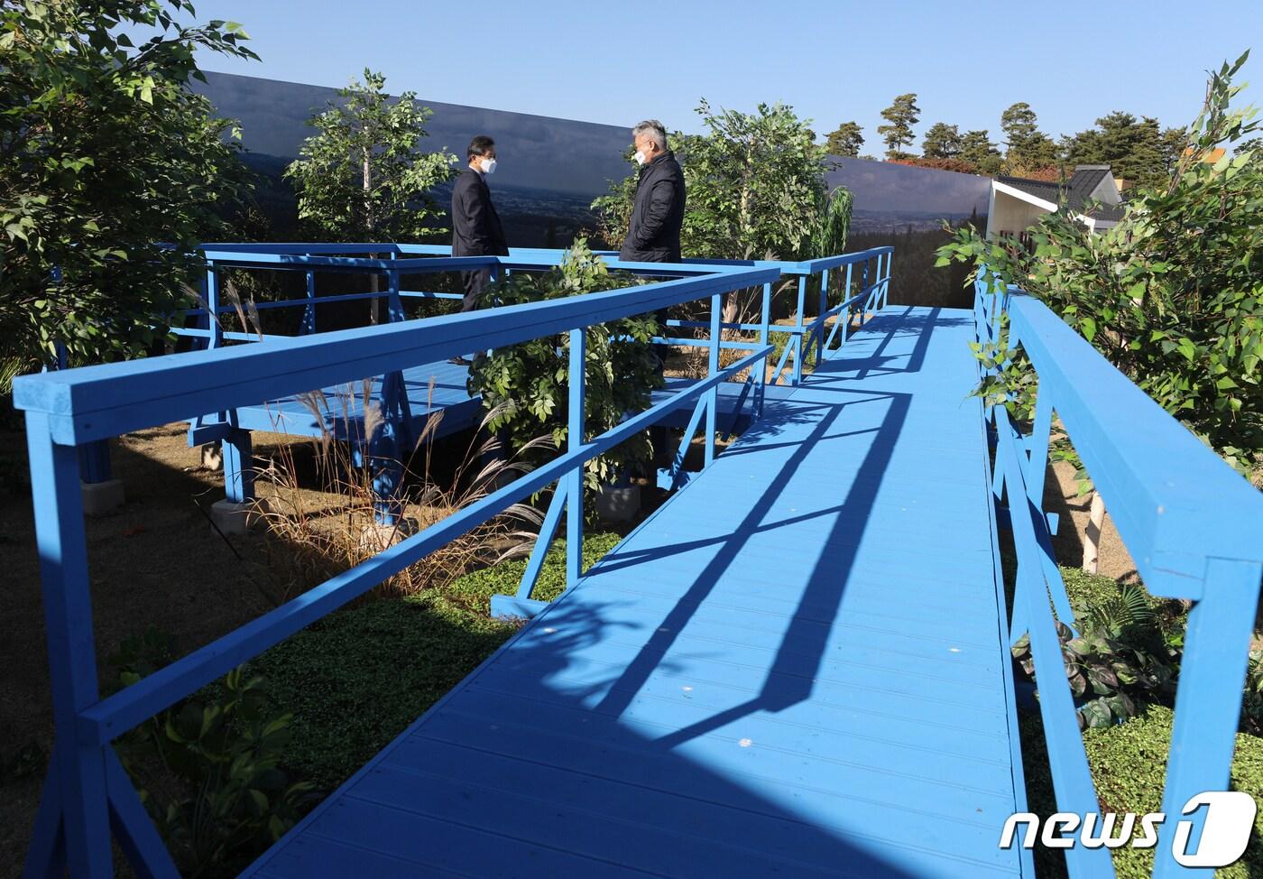 23일 오후 경기 파주시 임진각 평화누리에 마련된 DMZ빌리지에서 관람객들이 재현된 도보다리를 걷고 있다. DMZ빌리지는 분단의 현실을 예술적으로 재배치한 체험 공간으로 오는 25일까지 열린다. 2020.10.23/뉴스1 ⓒ News1 신웅수 기자