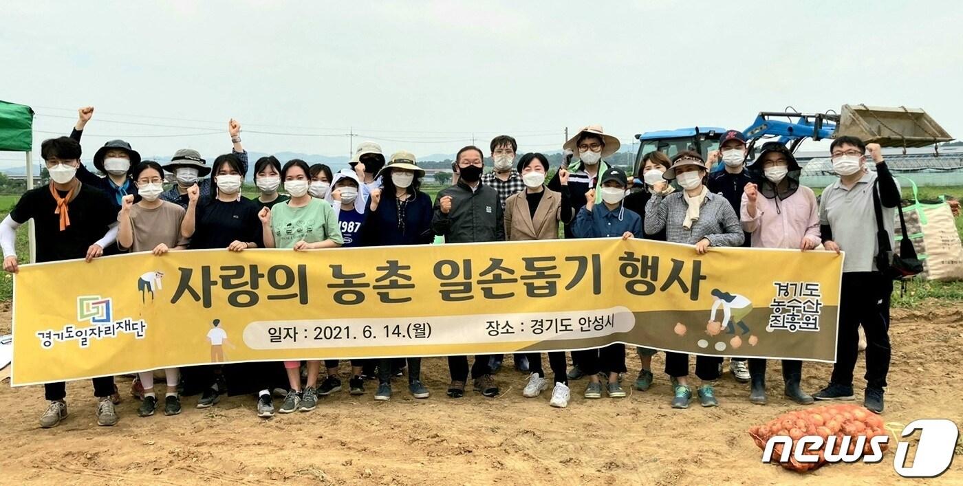 경기도일자리재단은 14일 안성시의 양파재배 농가에서 경기도농수산진흥원과 함께 농촌 일손돕기 봉사활동을 펼쳤다.(경기일자리재단 제공)ⓒ 뉴스1