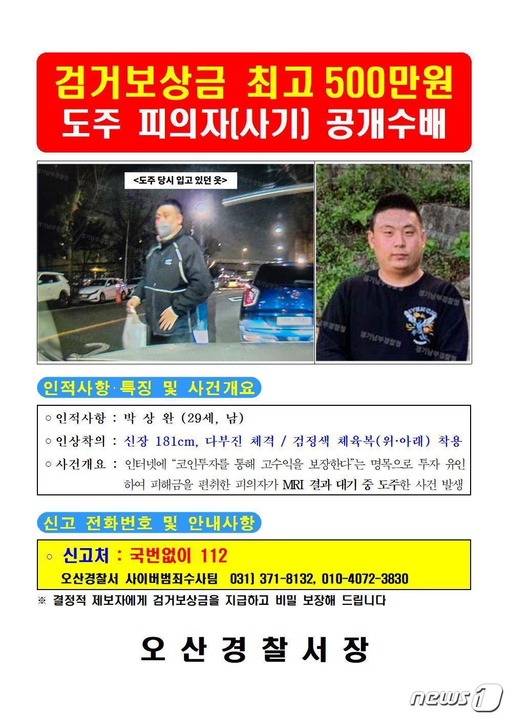 오산경찰서, 심의위 통해 결정…"도주 장기화 시, 추적 어려워"경기남부청 수사부 공조 추적 중…검거 시, 최대 500만원박상완 공개수배.(경기남부경찰청 제공)유재규 기자 광명-서울고속道 공사 감전사고 형사 책임자 6명 검찰 송치박승원 광명시장, 19~30일 지역 19개 동 순회 '시민과의 대화'