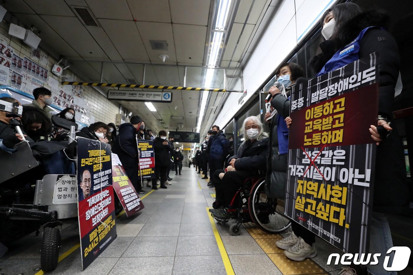 전국장애인차별철폐연대(전장연) 회원들이 19일 오전 서울 지하철4호선 혜화역에서 '장애인 권리 예산 확보를 위한 선전전'을 진행하고 있다. 전장연은 선전전을 통해 "이날 오후 4시까지 오세훈 서울시장과 단독 면담 수용을 기다리겠다"고 밝혔다" 또한 "면담 결과에 따라 오는 20일 지하철 탑승 시위를 재개 여부를 결정할 것"이라고 밝혔다. 2023.1.19/뉴스1 ⓒ News1 황기선 기자배수아 기자 '근로자 임금체불' 박영우 전 대유위니아 회장 '징역 6월' 추가 선고법원, '분당 흉기 난동' 유족에게 4억4000만원 배상 판결