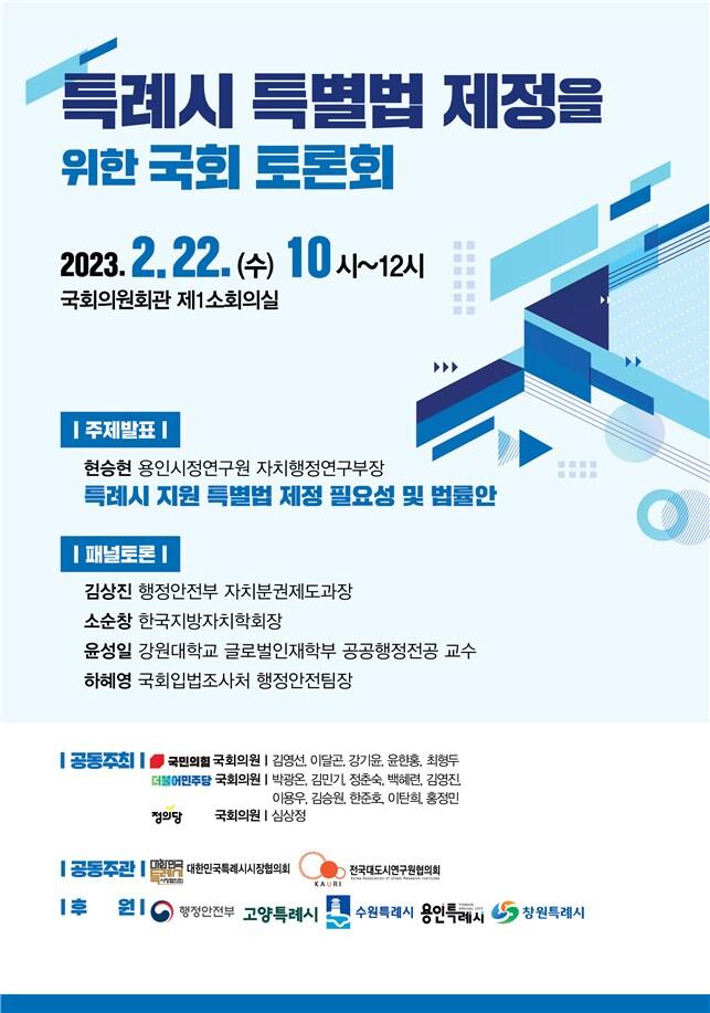 4개 특례시 국회의원 16명 공동 주최실질적 행정·재정 권한 확보 방안 논의대한민국특례시시장협의회 제공박대준 기자 김경일 파주시장, 17일 '시장실에 없는 시장' 출판기념회 개최고양시, 교통신호 개방사업 완료…“내비 실시간 신호등 정보 제공”