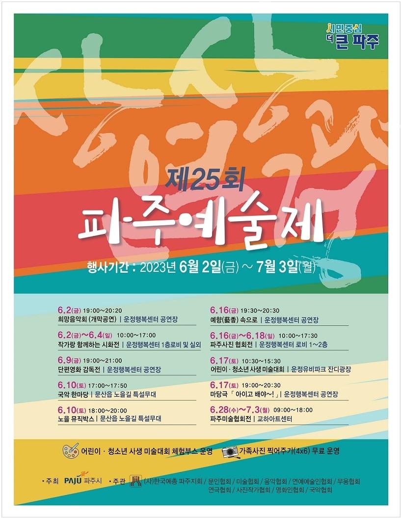 7월 3일까지 음악회·미술대회·공연·전시회 풍성(파주시 제공)관련 키워드파주예술제파주예총한국예술문화단체총연합회예술협회박대준 기자 김경일 파주시장, 17일 '시장실에 없는 시장' 출판기념회 개최고양시, 교통신호 개방사업 완료…“내비 실시간 신호등 정보 제공”관련 기사'파주예술제' 다음 달 5일 개막…16일간 풍성한 공연·전시 개최