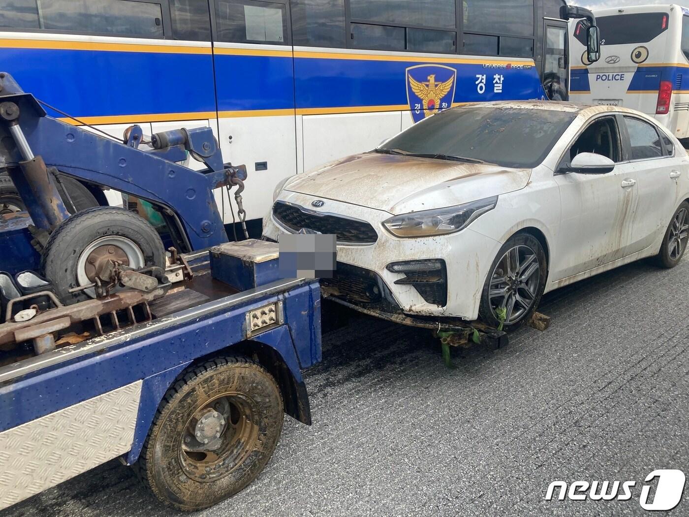 16일 폭우로 침수된 충북 청주시 오송 지하차도 내 물에 잠겨 있던 차량이 견인되고 있다.2023.07.16./뉴스1 ⓒ News1 박건영 기자