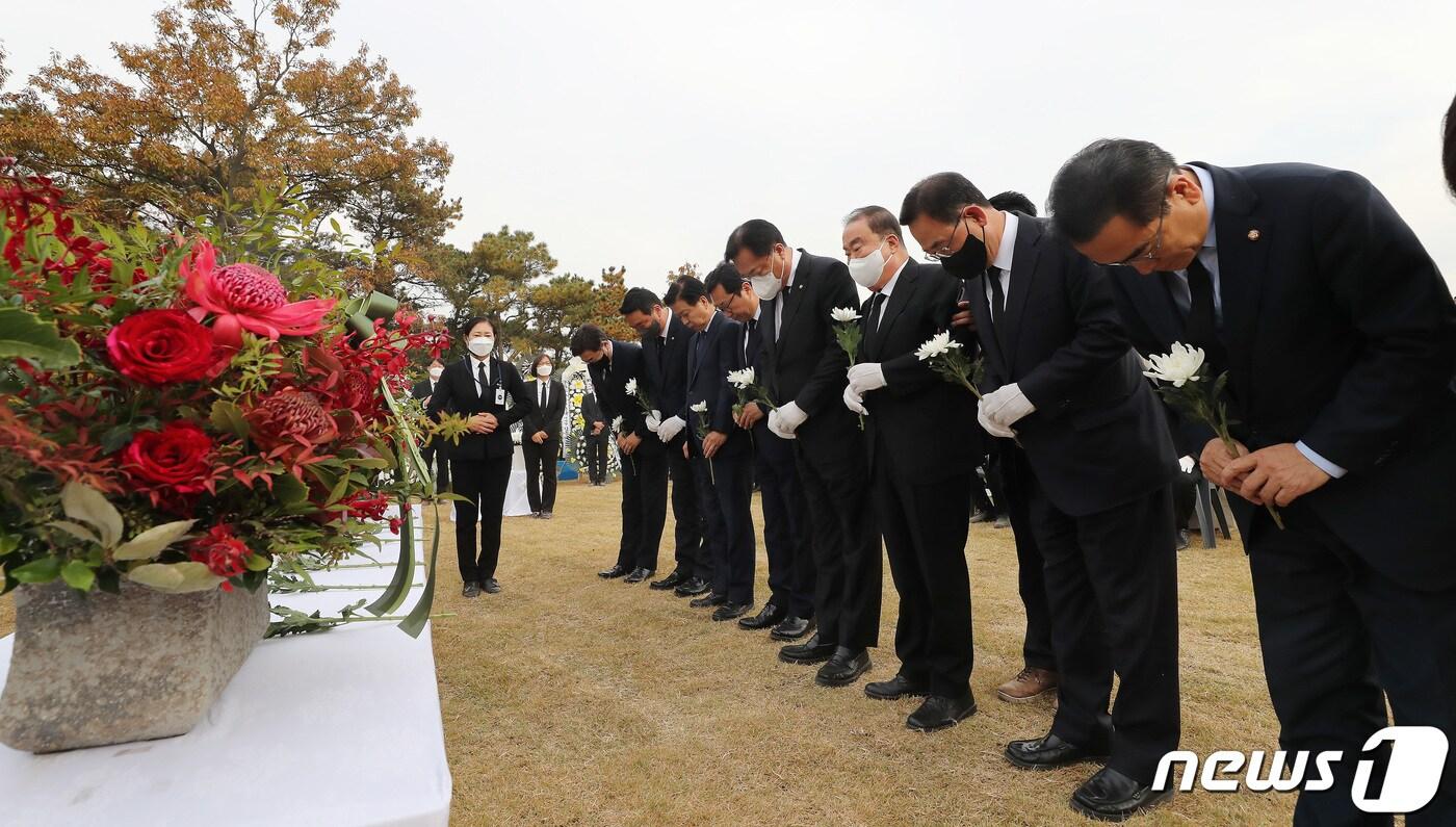 파주 동화경모공원서 열려지난해 10월 26일 오후 경기 파주시 동화경모공원에서 열린 고(故) 노태우 전 대통령 1주기 추모식에서 정진석 국민의힘 비상대책위원장과 문희상 전 국회의장, 주호영 국민의힘 원내대표 등이 묵념을 하고 있다. 2022.10.26/뉴스1 ⓒ News1 임세영 기자관련 키워드노태우2주기추모식동화경모공원노태우센터김기현윤재옥문희상박대준 기자 이동환 고양시장 “미래 성장 산업 'AI 중심 도시'로 탈바꿈”경기도, '미지급용지' 15개 시군 65필지 2만여㎡ 보상 추진관련 기사민주 대구시당 "6월항쟁 38주년…더 깊고 성숙한 민주주의로 나아가야"6년째 5·18 참배 盧 아들…"할아버지는 학살자" 외친 全 손자는?