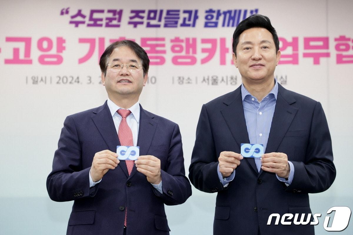 이동환 시장 “서울 출퇴근 교통비 부담 줄어”25일 서울시청에서 열린 '서울시-고양시 기후동행카드 참여 업무협약식'에서 오세훈 서울시장(오른쪽)과 이동환 고양시장이 기후동행카드를 들고 기념촬영을 하고 있다. (고양시 제공)관련 키워드기후동행카드고양시서해선지하철 3호선경의중앙선오세훈이동환박대준 기자 김경일 파주시장, 17일 '시장실에 없는 시장' 출판기념회 개최고양시, 교통신호 개방사업 완료…“내비 실시간 신호등 정보 제공”
