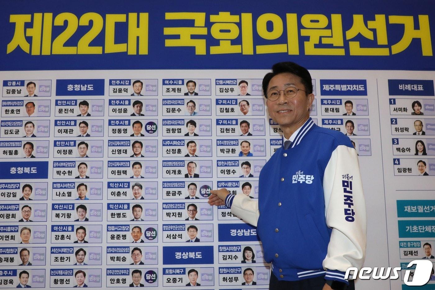 4·10총선이 막을 내린 가운데 경기지역에서는 현역의원 30명(민주당 27명, 국민의힘 3명)이 치열한 경쟁을 뚫고 국회 재입성에 성공했다. 사진은 6선에 성공한 조정식 더불어민주당 사무총장이 지난 10일 국회 의원회관 제22대 국회의원선거 상황실에서 개표초반 일찌감치 당선된 문금주 전남 고흥보성장흥강진 후보 이름표에 당선스티커를 붙이고 있는 모습. (공동취재) 2024.4.10/뉴스1 ⓒ News1 임세영 기자