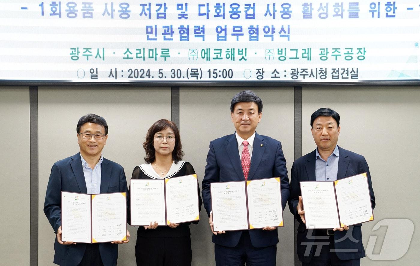 광주시가 30일 시청 접견실에서 ㈜빙그레 광주공장 등과 1회용품 사용 저감 및 다회용컵 사용 활성화를 위한 업무협약 체결하고 있다.(광주시 제공)관련 키워드경기광주1회용컵업무협약대표시장김평석 기자 이천시, 휴먼빌에듀파크시티아파트와 다함께돌봄센터 협약 체결용인시·다낭시, 우호협약 체결…산업·경제 등 각 분야서 협력관련 기사"노 플라스틱"…광주시 23일까지 세계양궁대회 친환경 캠페인한강청, 서울·경기 5개 지자체와 '1회용품 없는 축제' 협약광주세계양궁선수권대회 D-150일…"평화의 울림 전파"낡은 광주기아챔피언스필드 관람석 의자 전면 교체전진선 양평군수 "양평고속도로 등 교통현안 해결 위해 최선"
