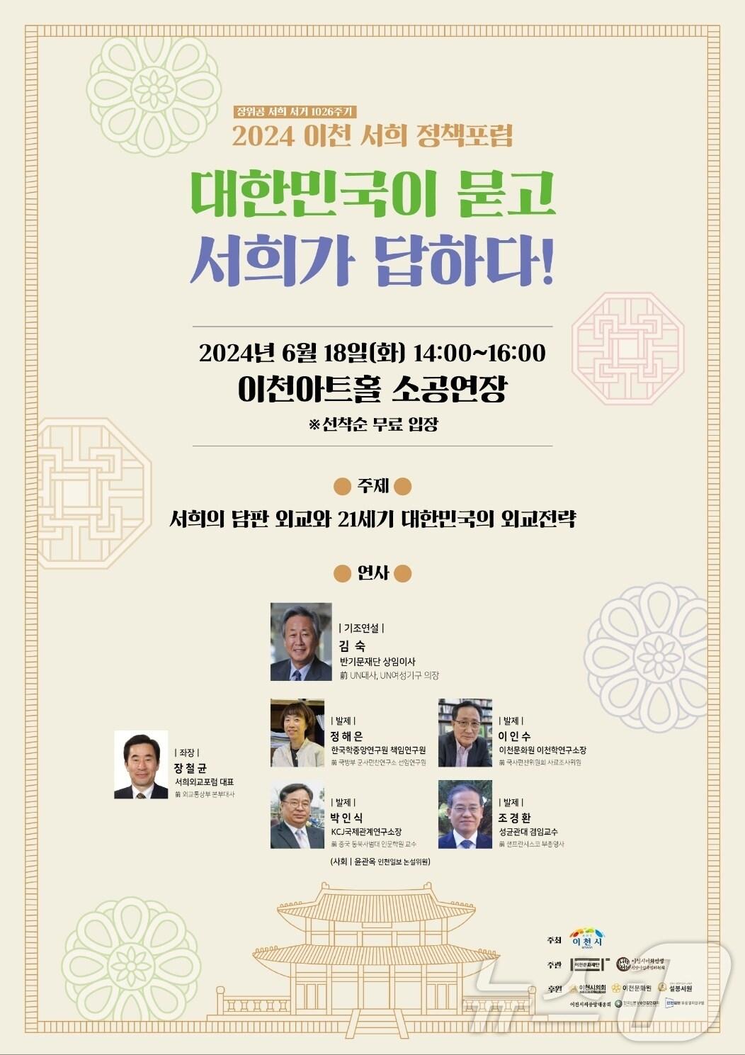 18일 이천아트홀… 김숙 전 주유엔대사 등 전문가 토론서희 정책포럼.포스터.(이천시 제공)관련 키워드이천시서희고려시대외교국제외교방향김평석 기자 경기 광주시, '주거복지대전'서 대통령 표창…전국 최우수용인FC, 측면 강화 김한길 FA 영입…"전술 이해도 뛰어나"관련 기사이천시, 서희외교문화제 기념 '전국사진촬영대회' 개최이천과학고 부지 증일동서 '마암리 시유지'로 변경…2030년 개교 목표