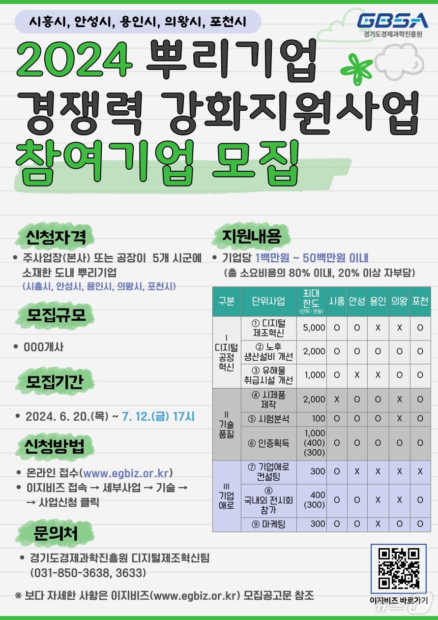 디지털 공정혁신 등 3개 분야… 시흥 등 5개 시 대상경기도경제과학진흥원이 ‘2024년 뿌리기업 경쟁력 강화 지원 사업(2차)’ 참여기업을 오는 12일까지 모집 중이다.(경기도경제과학진흥원 제공)/ 송용환 기자 경기아트센터 '공연장 상주단체 지원사업' 참여 단체 모집안양예술인센터 입주자 모집…연간 사용료 최저 55만원
