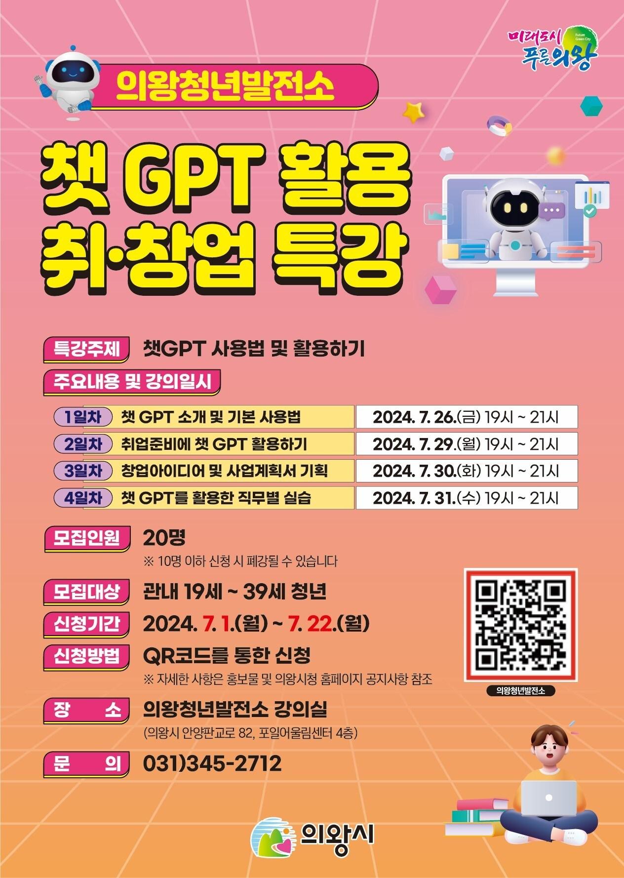 오는 26일부터 4일간 의왕청년발전소서 진행경기 의왕시 '챗GPT 활용 취·창업 특강' 홍보물. (의왕시 제공) 2024.7.4/뉴스1 김기현 기자 의왕시, 왕송호수 소각장 설치 '원점 재검토'…"타당성 용역 추진"부천 금은방 여주인 살해한 40대 남성, 종로3가역 출구서 검거