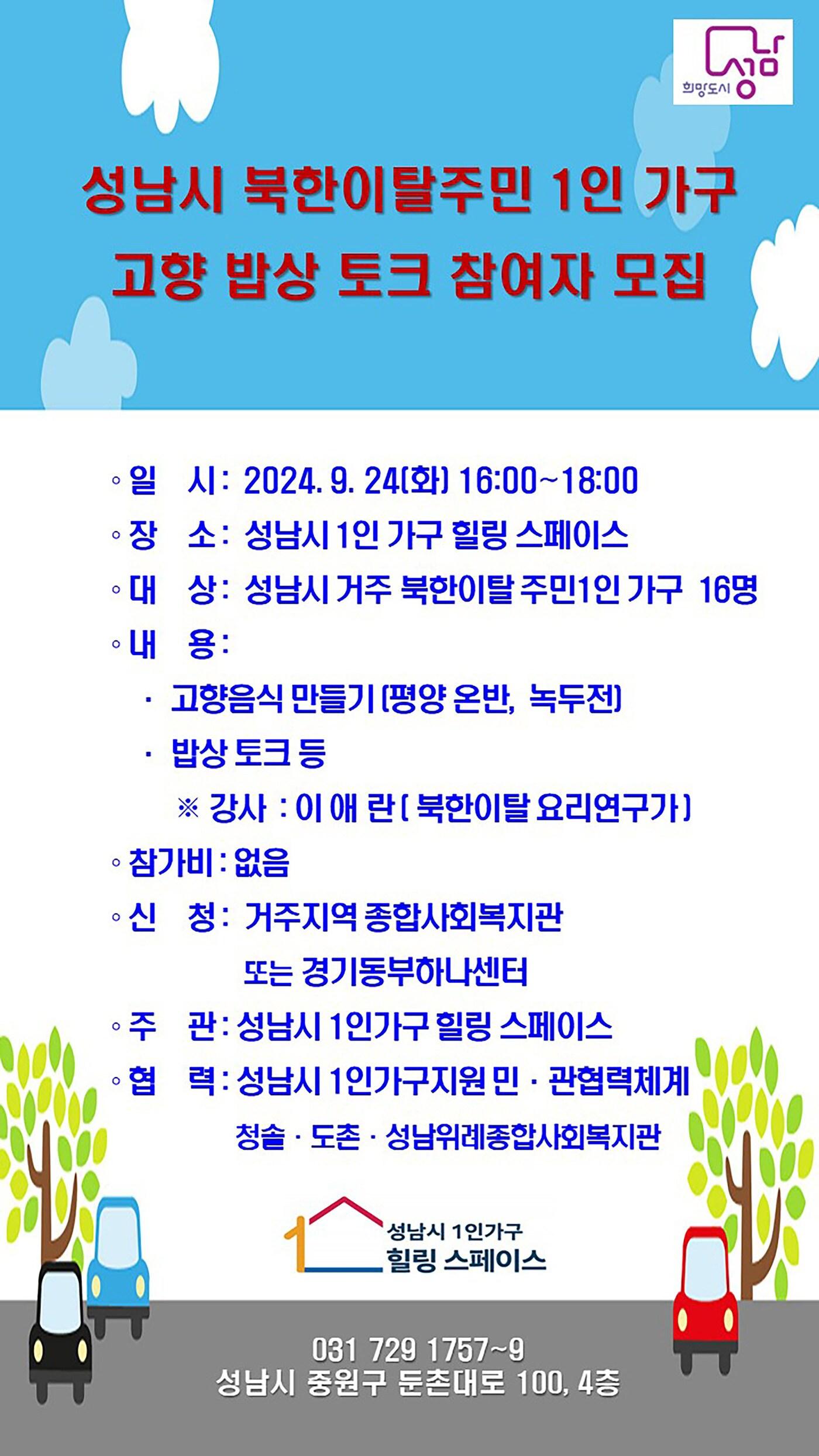 공동체 형성, 지역정착 지원…시 “친분 쌓고 소통하는 자리 될 것”경기 성남시가 오는 24일 ‘북한이탈주민 1인 가구 고향밥상 토크’ 행사를 연다.(성남시 제공)/관련 키워드성남시북한이탈주민송용환 기자 경기아트센터 '공연장 상주단체 지원사업' 참여 단체 모집안양예술인센터 입주자 모집…연간 사용료 최저 55만원관련 기사민주평통 서울지역회의, 제1회 탈북민과 함께하는 통일음악회 개최성남 북한이탈주민 공무원, 산불 이재민 위해 첫 월급 기부