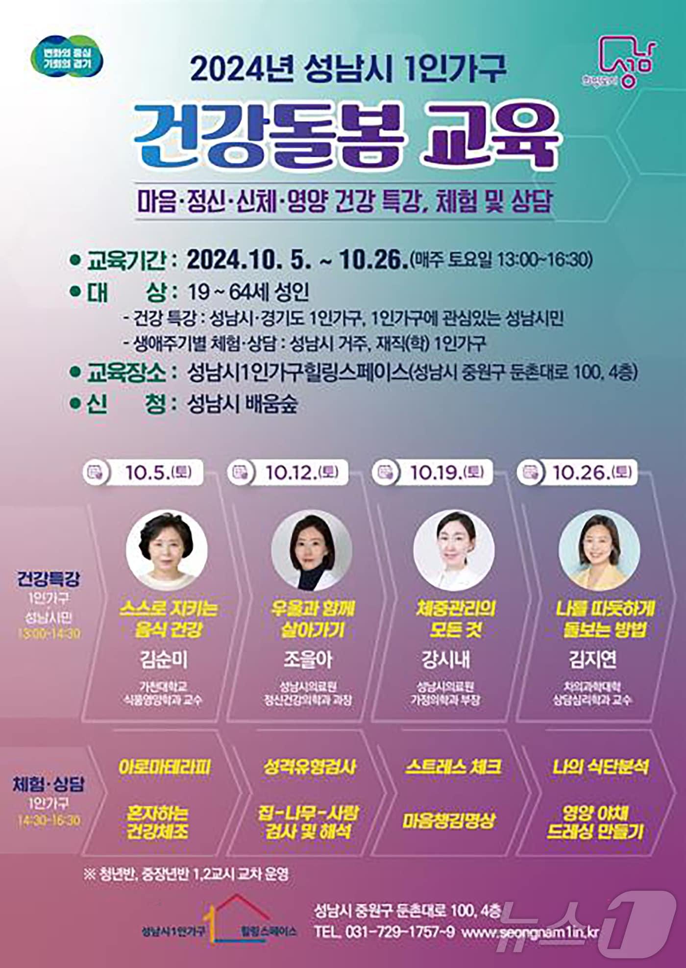 체중관리 특강·명상…‘배움숲’ 홈페이지 통해 신청경기 성남시가 '1인가구 힐링스페이스'에서 건강 돌봄 교육 프로그램을 운영 중이다.(성남시 제공)/관련 키워드성남시1인 가구 힐링스페이스송용환 기자 안양예술인센터 입주자 모집…연간 사용료 최저 55만원안양시 '지방규제혁신 성과평가' 전국 유일 3년 연속 최우수관련 기사성남시 '1인 가구 병원 안심동행' 인력 4→5명 확대성남시 '외로움·우울감' 1인 가구 전문상담센터 5곳 운영