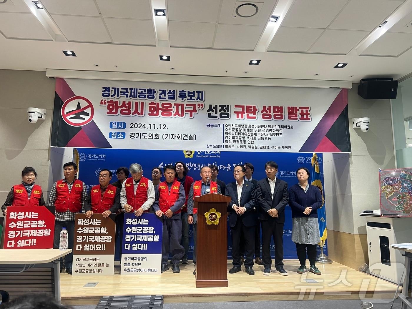 ‘수원군공항 이전 야욕’ 의구심…“제외할 때까지 싸울 것”‘수원전투비행장 화성이전 반대 범시민대책위원회’가 12일 오전 경기도의회 브리핑룸에서 화성시 화옹지구의 경기국제공항 후보지 선정에 반대하는 기자회견을 열고 있다./송용환기자관련 키워드경기국제공항화성시 화옹지구송용환 기자 신상진 성남시장 "대장동 범죄수익, 1원 남김없이 환수할 것"황정민·정성화·정상훈, '미세스 다웃파이어'로 경기아트센터 찾는다관련 기사화성서부발전協 "화옹지구에 경기국제공항 건설해야"수원군공항 이전 지지 단체 “수원-화성 협력해 문제 해결해야”경기 시민단체들 '군 공항 이전 조례안'에 반발…"철회하라"시민단체 "'경기국제공항 유치·건설 조례 폐지' 적극 지지"