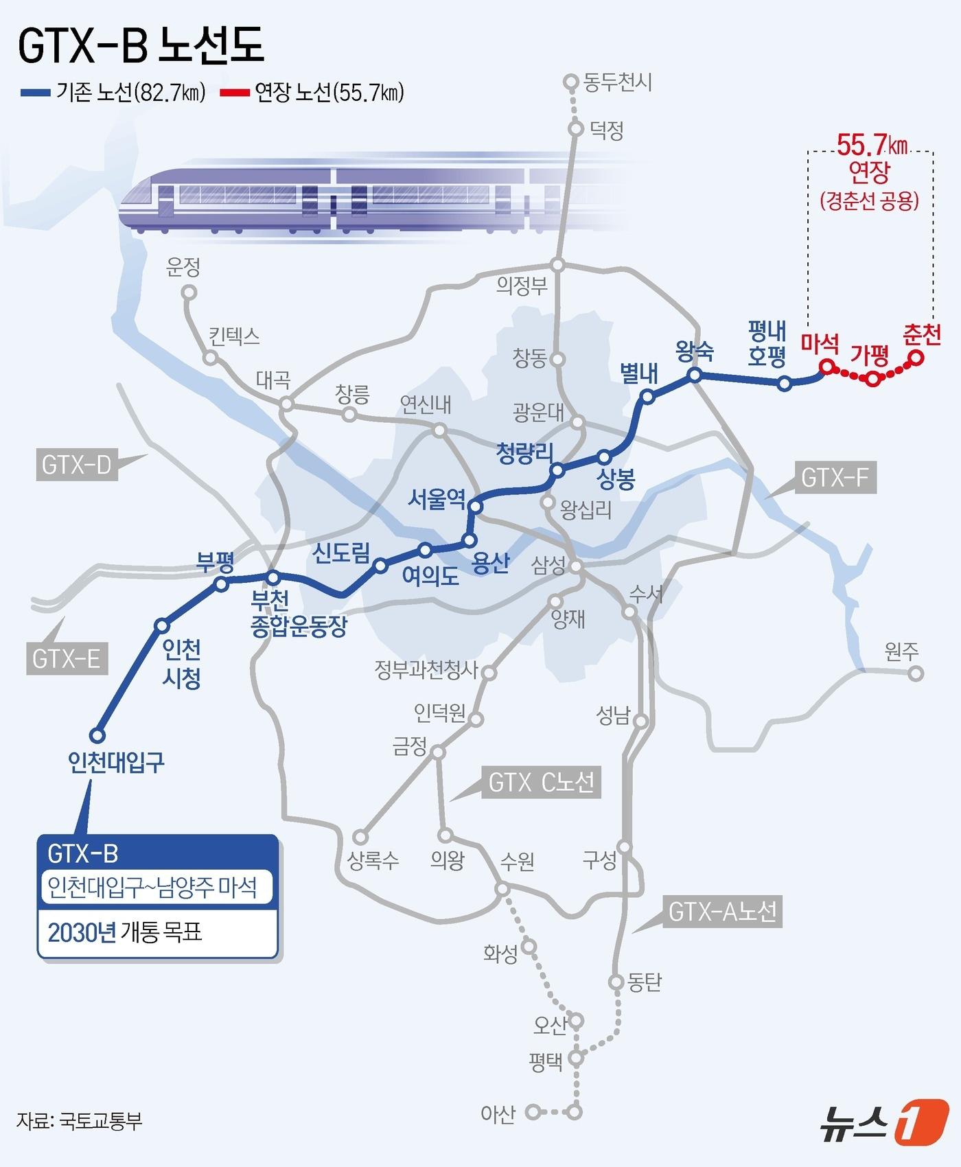 GTX-B 가평·춘천 연장 시 정차 필요성 주장수도권광역급행철도(GTX)-B의 가평·춘천 연장사업이 본격 추진된다. GTX-B는 인천대입구~남양주 마석 구간으로, 오는 2030년 개통을 목표로 한다. 이번 연장 사업은 GTX-B 본선 종착역인 남양주 마석에서 가평과 춘천까지 총 55.7km를 추가하는 것이다. ⓒ News1 김지영 디자이너관련 키워드GTX-B수도권광역급행철도청평역정차촉구서명운동양희문 기자 가평군, 12월까지 청평면 대성리에 54홀 규모 파크골프장 조성이현재 하남시장 "주민들 불편 감내…위례신사선 예타 통과해야"