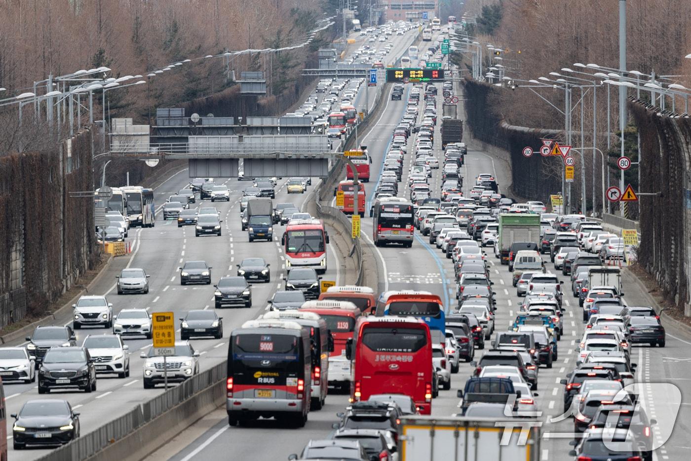설 명절을 앞둔 26일 오후 서울 서초구 잠원IC 부근에서 경부고속도로 하행선 방향에 차량이 정체되고 있다. 한국도로공사에 따르면 이날 전국에서 425만 대가 이동할 것으로 예상된다. 수도권에서 지방으로 41만 대, 지방에서 수도권으로 30만 대 이동할 것으로 보인다. 귀성 방향 정체는 오전 6~7시에 시작돼 정오부터 오후 1시 사이에 최대 수준을 보이다가 오후 10~11시쯤 해소될 것으로 전망된다. 2025.1.26/뉴스1 ⓒ News1 이승배 기자