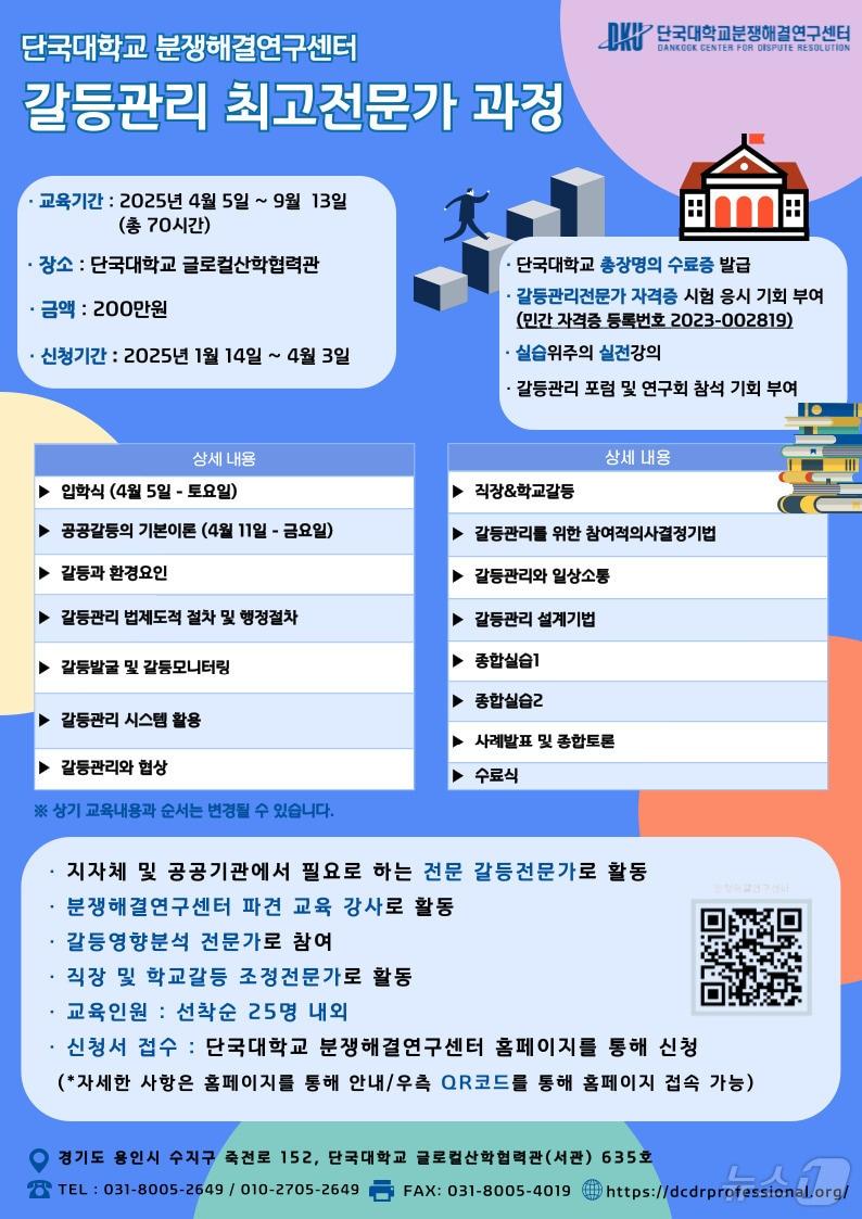 자격 취득 시 연구과제 수행·교육강사·갈등조정관 등 진출단국대 '갈등 관리 최고전문가과정' 교육생 모집 홍보 포스터.(단국대 제공)관련 키워드단국대갈등분쟁해결연구센터관리예방김평석 기자 '경기지사 출마한다는데'…추미애 "2등 시민 의식" 발언에 거센 후폭풍이천시, 2025년 경기도 누구나 돌봄 사업 최우수상 수상관련 기사'공공갈등 대응'…화성시, 공직자 갈등관리 역량 강화 교육 진행"이분법적 갈등조장 경계"…유통 규제에 소상공인도 '온도차'