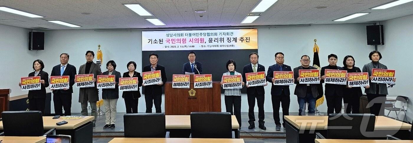 의장 선거서 기표지 촬영해 대화방에 올려…16명 기소경기 성남시의회 더불어민주당협의회가 13일 세미나실에서 기자회견을 열어 후반기 의장선출 과정에서 부정선거 혐의로 기소된 국민의힘 의원들에 대한 징계를 추진하기로 했다고 밝혔다. (성남시의회 민주당협의회 제공. 재판매 및 DB금지)/뉴스1관련 키워드성남시의회더불어민주당국민의힘송용환 기자 경기아트센터 '공연장 상주단체 지원사업' 참여 단체 모집안양예술인센터 입주자 모집…연간 사용료 최저 55만원관련 기사강득구 "李대통령 중심 당청 원팀…친명·친청 없다"…출사표[인터뷰 전문]홍익표 "김현지, 국감 출석하는 게 가장 깔끔"의장 선출 두고 욕설·고성 난무…성남시의회 파행 운영'친명' 혁신회의 "김현지, 김일성 추종세력 연결 주장 박정훈 고발"성남시의회 국힘-민주당 '행정교육위원장 불신임 의결'에 충돌