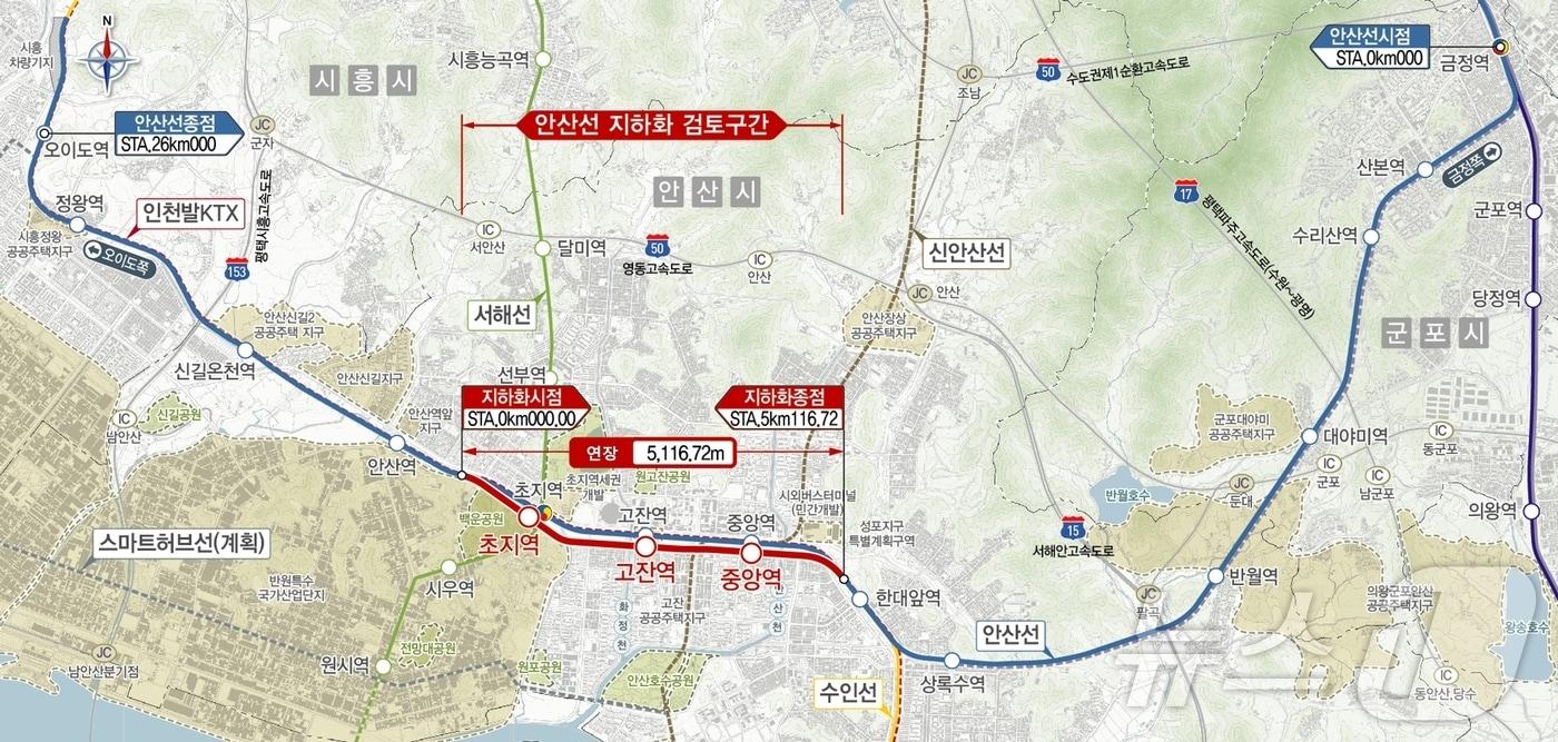 지상 71만여㎡ 개발로 사업비 충당…2028년 착공 계획국토부 철도지하화 통합개발 선도사업 선정 '안산선' 구간. (경기도 제공, 재판매 및 DB금지)관련 키워드철도지하화안산선경인선초지역고잔역중앙역박대준 기자 이동환 고양시장 “미래 성장 산업 'AI 중심 도시'로 탈바꿈”경기도, '미지급용지' 15개 시군 65필지 2만여㎡ 보상 추진관련 기사경기도 '철도지하화' 사업에 경부선·경인선 구간 반영 제안군포시 "경부선, 안산선 지화하 적극 추진"부산·대전·안산에 총 4.3조원 규모 '철도 지하화' 사업 추진한다