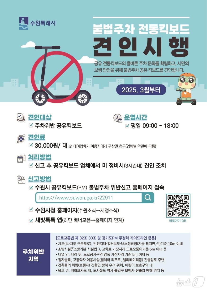 불법 주차된 공유 전동킥보드·자전거 신고할 경우 시가 직접 현장 조치경기 수원시 불법 주차 공유킥보드 견인 안내문. (수원시 제공. 재판매 및 DB 금지) 2025.2.27/뉴스1 김기현 기자 경부고속도로 판교JC 부근서 고속버스 3대 연쇄 추돌…13명 부상수원 정자동 다세대주택 지하서 화재…주민 2명 중·경상