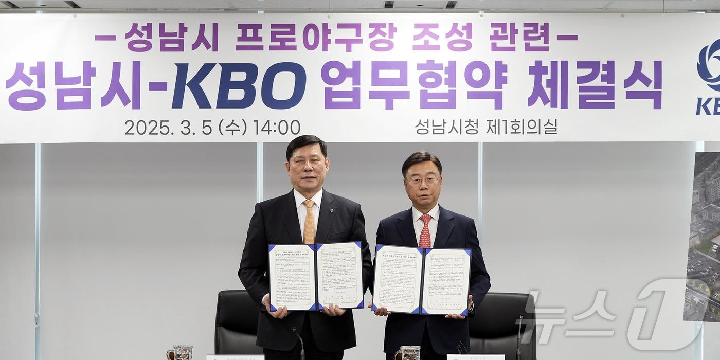 성남종합운동장 리모델링 해 2만석 야구전용구장 조성신상진 경기 성남시장(오른쪽)과 허구연 KBO 총재가 5일 시청에서 열린 '성남시 프로야구장 조성 성남시, KBO 업무협약식' 서명 후 기념촬영하고 있다.(성남시 제공. 재판매 및 DB금지)/뉴스1관련 키워드성남시KBO송용환 기자 경기아트센터 '공연장 상주단체 지원사업' 참여 단체 모집안양예술인센터 입주자 모집…연간 사용료 최저 55만원관련 기사성남시, 야구전용구장 설계용역 착수…내년 하반기 첫 삽성남시 프로야구장 설계안 확정…382억 투입 2028년 개장'연고지 이전 검토' NC "성남시서 좋은 제안 오면 진지하게 고려할 것"'KIA 김도영 팬' 김길리, 또 샤라웃 "내년 동계 올림픽·WBC 함께 파이팅"'챔피언' KIA, 홈 개막전 시구자로 배우 박신혜·쇼트트랙 김길리 초청