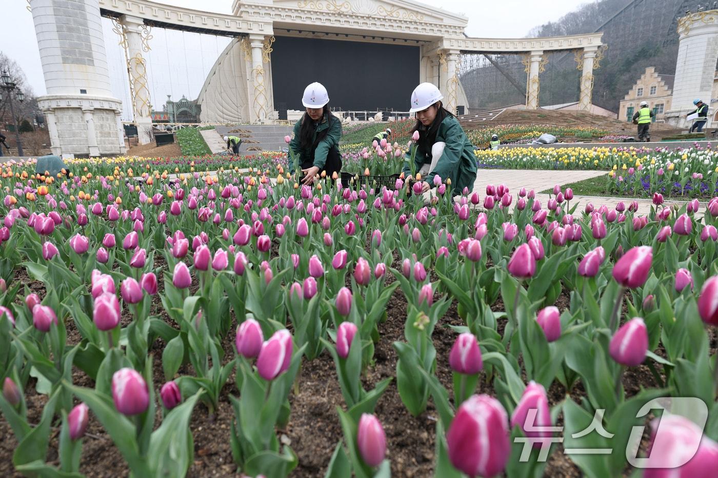 12일 오전 경기 용인시 처인구 에버랜드 포시즌스가든에서 관계자들이 만개를 앞둔 튤립을 살펴보는 등 튤립 축제 준비를 하고 있다. 에버랜드 튤립축제는 이달 21일 개막하며 포시즌스가든에 산리오캐릭터즈와 협업한 봄꽃 야외 테마정원을 선보인다. 2025.3.12/뉴스1 ⓒ News1 김영운 기자