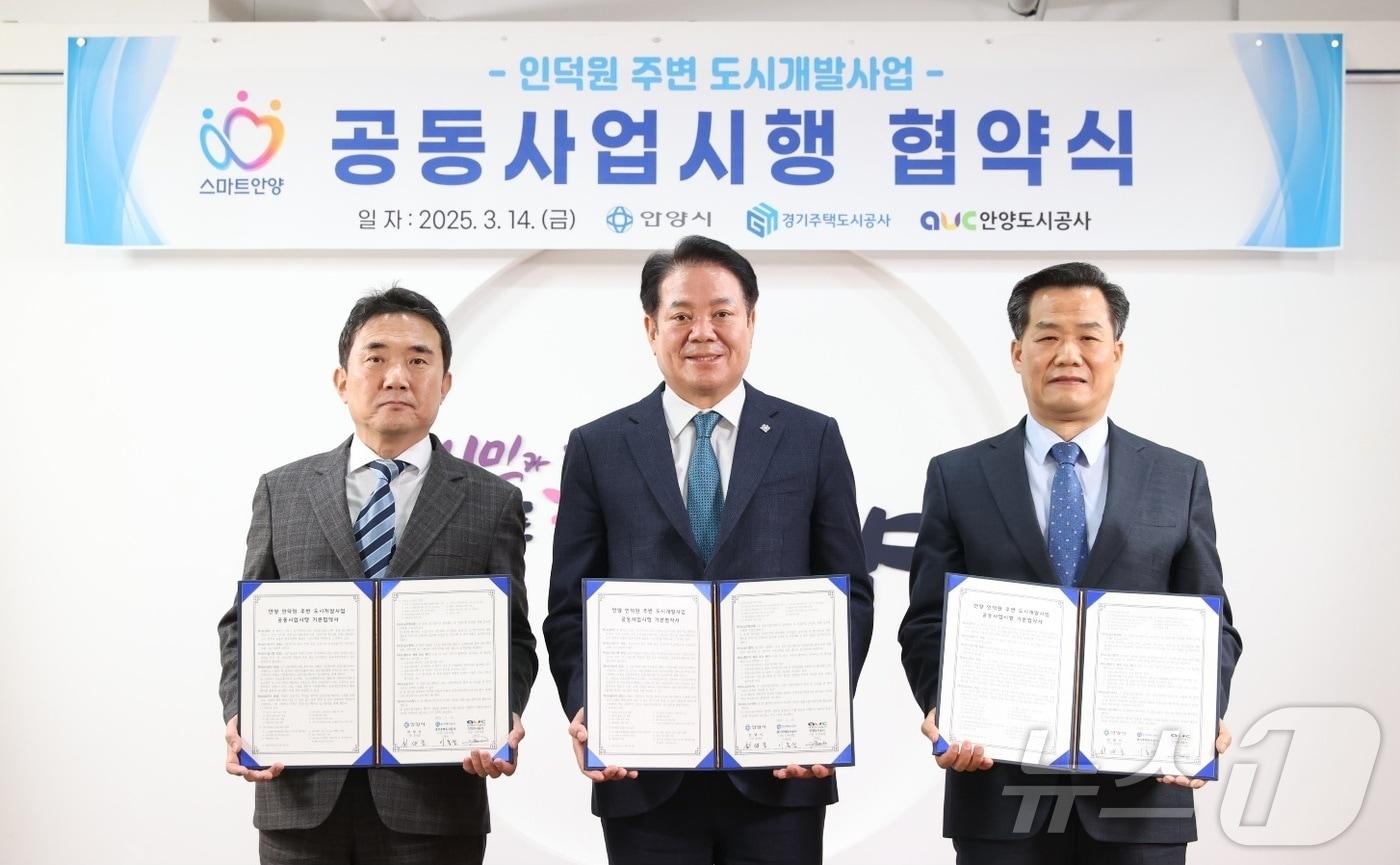 GH·안양도공과 협약…최대호 시장 "지속 가능한 도시 발전"경기 안양시가 14일 경기주택도시공사·안양도시공사와의 협약을 통해 ‘인덕원 주변 도시개발사업’을 본격 추진하기로 했다. 왼쪽부터 이종선 경기주택도시공사 사장 직무대행, 최대호 안양시장, 김병근 안양도시공사 사장 직무대행.(안양시 제공. 재판매 및 DB금지)/뉴스1관련 키워드인덕원안양시경기주택도시공사안양도시공사송용환 기자 안양예술인센터 입주자 모집…연간 사용료 최저 55만원안양시 '지방규제혁신 성과평가' 전국 유일 3년 연속 최우수관련 기사안양에 15만㎡ '인텐스퀘어' 착공…환승시설·공동주택 등 조성인덕원 기회타운 첫 삽…김동연 "상전벽해 기적·성과 만들 것"수원·용인·안양에 경기도형 도시모델 '기회타운' 조성(종합)최대호 안양시장 "핵심사업 속도감 있게 추진해 성과 낼 것"