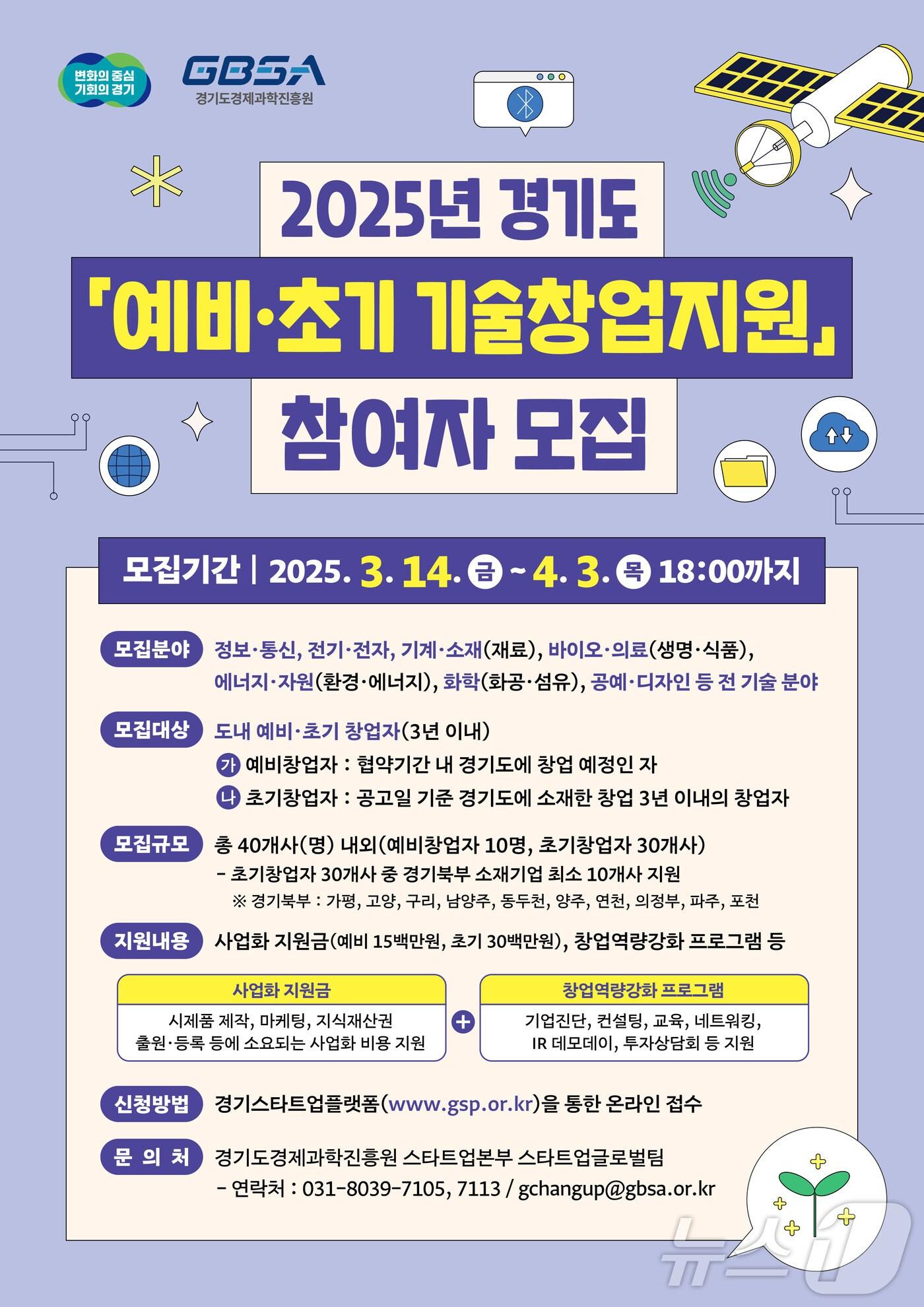 예비창업자 10개사·초기창업자 30개사 선발2025년 경기도 예비초기 기술창업지원 참여자 모집 포스터.(경기도 제공, 재판매 DB 금지)최대호 기자 김동연 “서울 버스 운행 재개 다행…도민 출퇴근 길 지키기 최선”안산사이언스밸리, 경기경제자유구역 신규 지구 추가 지정