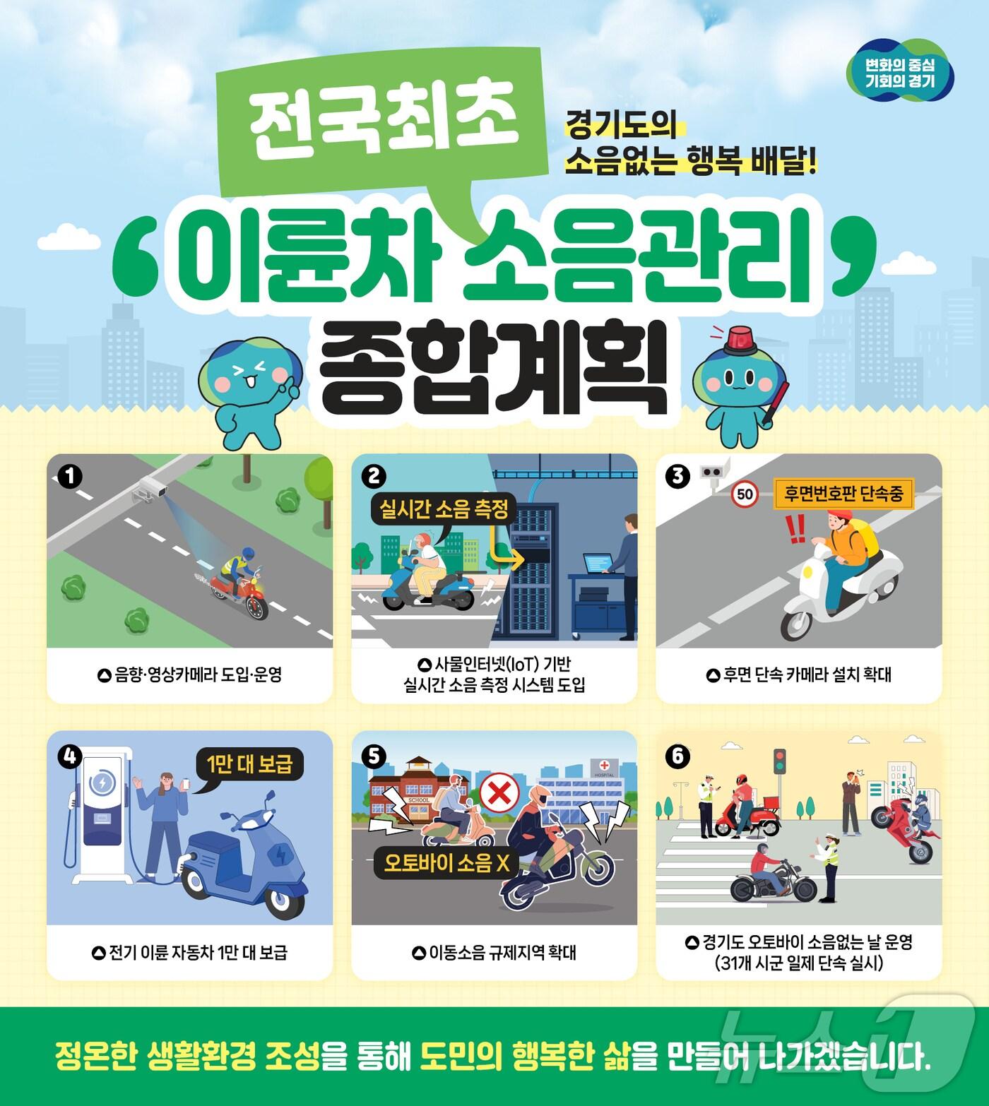 소음피해 사전예방 등 4개분야 12개 중점 과제 선정…전국 처음배달 오토바이 소음 관리 추진 그래픽.(경기도 제공, 재판매 및 DB 금지)최대호 기자 경기도 특사경, 명절 먹거리 불법 유통 단속…대형마트 등 360곳김동연 “서울 버스 운행 재개 다행…도민 출퇴근 길 지키기 최선”
