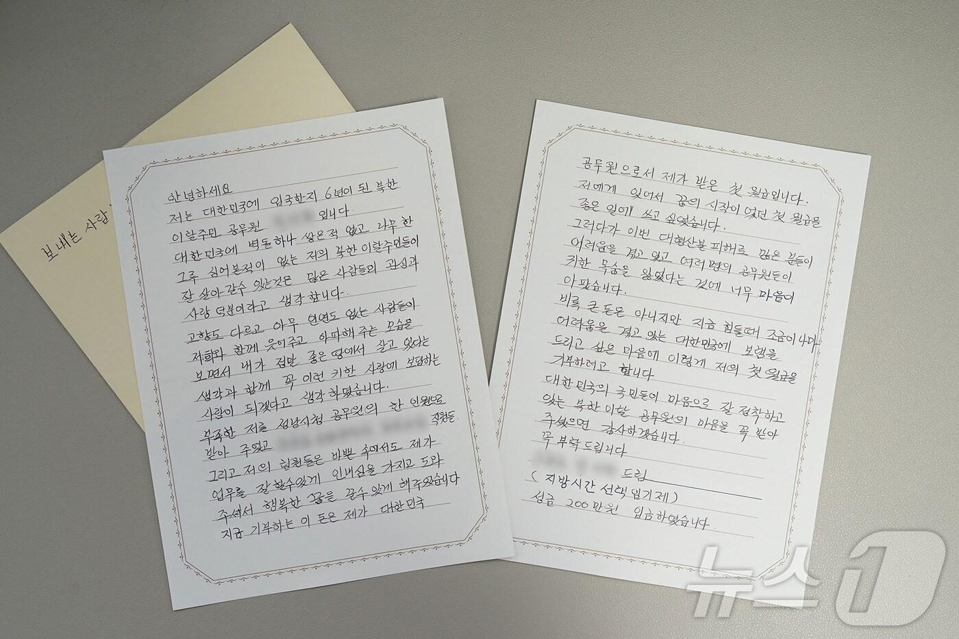 2년 임기제로 최근 채용…"제가 받은 관심과 사랑에 보답"경기 성남시의 북한이탈주민 공무원 A씨가 첫 월급 전액을 강원·경북의 대형 산불 피해 이재민을 위해 기부했다. 사진은 A 씨가 기부금과 함께 보낸 편지.(성남시 제공. 재판매 및 DB금지)/뉴스1관련 키워드성남시산불북한이탈주민송용환 기자 경기아트센터 '공연장 상주단체 지원사업' 참여 단체 모집안양예술인센터 입주자 모집…연간 사용료 최저 55만원