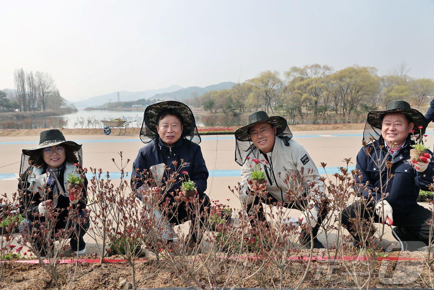 서태원 경기 가평군수(왼쪽에서 두 번째)가 자라섬 중도에서 봄꽃을 심고 있다.(가평군 제공, 재판매 및 DB 금지)/뉴스1관련 키워드가평군식목행사자라섬양희문 기자 가평군, 12월까지 청평면 대성리에 54홀 규모 파크골프장 조성이현재 하남시장 "주민들 불편 감내…위례신사선 예타 통과해야"