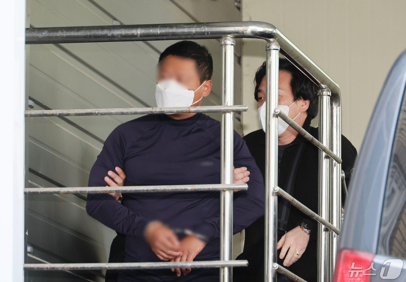 유튜브 라이브 방송을 하던 50대 남성을 흉기로 찔러 살해한 피의자 50대 남성 A씨가 부산 연제구 연제경찰서로 압송되고 있다. (공동취재) 2024.5.9/뉴스1 ⓒ News1 윤일지 기자