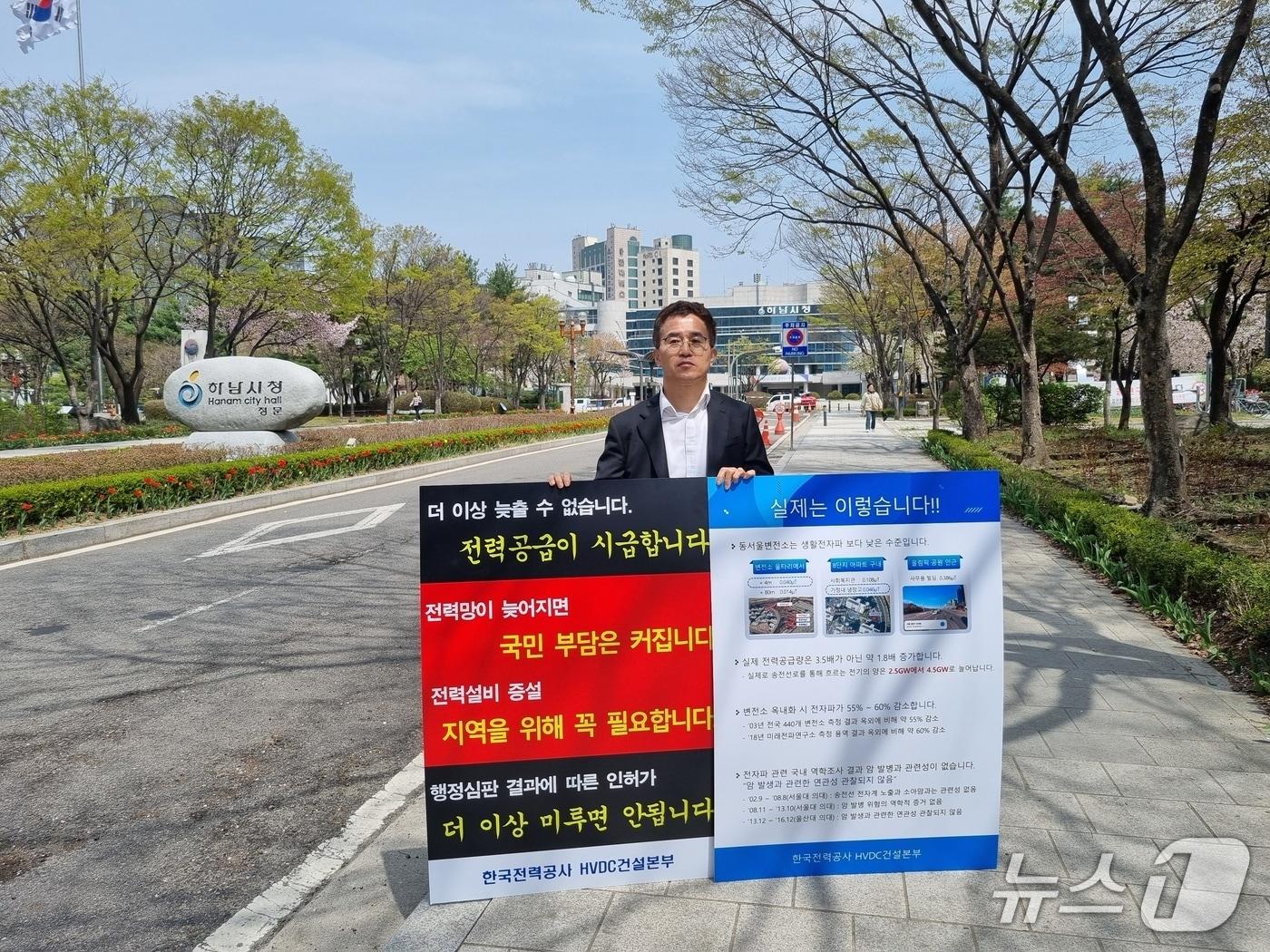하남시, 행정심판 패소에도 인허가 내주지 않고 버텨한전 "전력수급 불안정에 따른 전기요금 인상 가능성" 김호기 한국전력공사 HVDC 건설본부장이 지난 16일 경기 하남시청 앞에서 '동서울 변전소 옥내화 허가'를 촉구하는 1인 시위를 하고 있다.(한국전력 제공, 재판매 및 DB 금지)/뉴스1동서울변전소 증설 전후 전기 흐름도(한국전력 제공, 재판매 및 DB 금지)/뉴스1 동서울변전소가 있는 감일지구 전자파 측정량(한국전력 제공, 재판매 및 DB 금지)/뉴스1 한국전력이 경기 하남시 감일동 일원에 동서울변전소 관련 소통라운지를 마련했다.(한국전력 제공, 재판매 및 DB 금지)/뉴스1관련 키워드한국전력하남시동서울변전소증설옥내화인허가전력수급감일동양희문 기자 경기북부소방, 대한송유관공사 현장점검…겨울철 화재예방 총력하남시, 주민과의 대화 개최…각 동 행정복지센터 순회관련 기사한전 "동서울 HVDC 변환소 사업 12월 인허가 추진"동서울변전소 경관심의 조건부 가결…한전 "후속 절차 협조" 당부동서울변전소 경관심의 조건부 의결…한전 반발 예상한국전력, 하남 어린이집 원아들 전기박물관 견학한전 "동서울변환소 경관심의 촉구…반려 시 법적 조치"