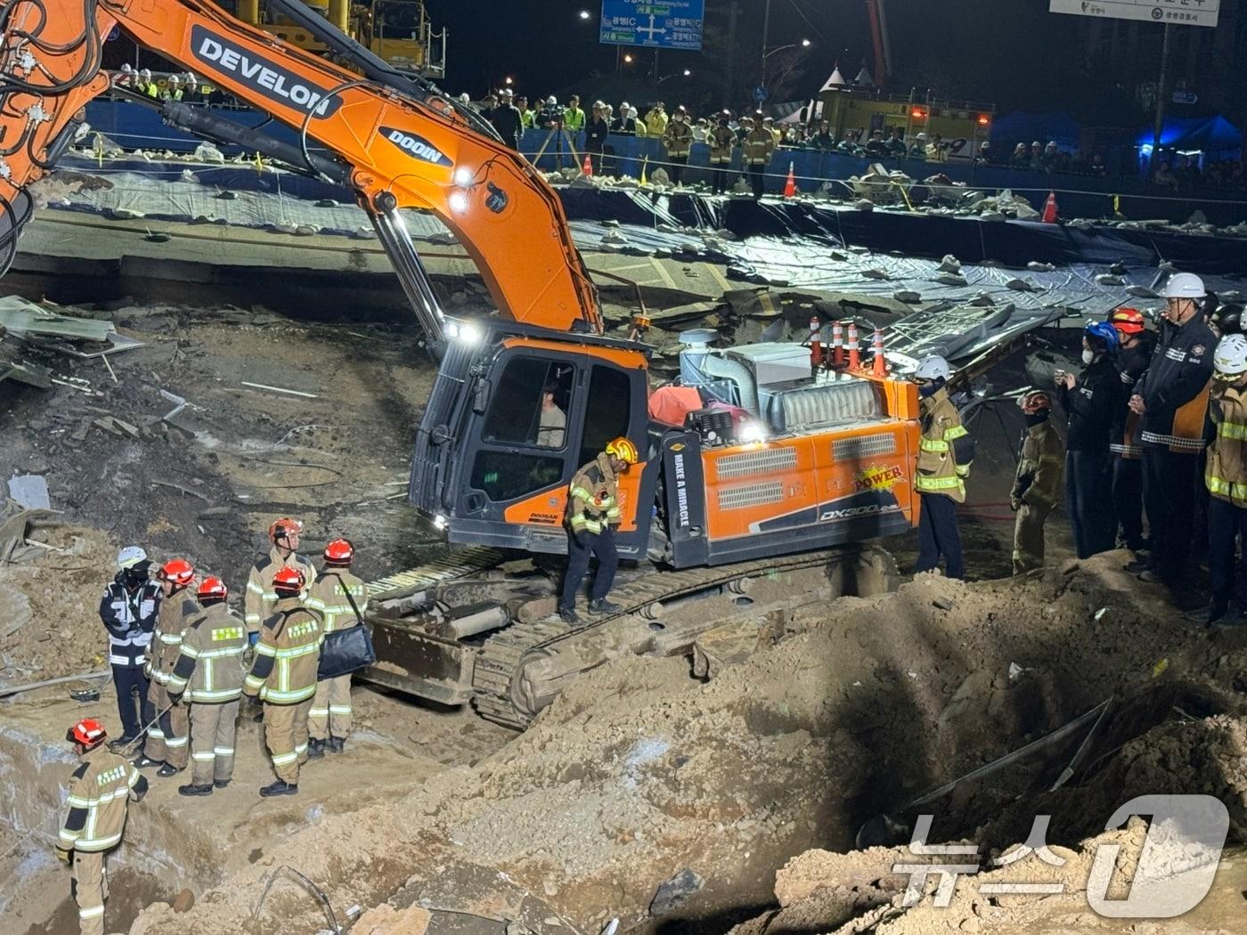 16일 오후 경기 광명시 일직동 신안산선 복선전철 5-2공구 붕괴 현장에서 소방대원들이 실종자를 수습하고 있다. 신안산선 붕괴사고 실종자 A씨는 수색작업 6일만인 이날 오후 8시 3분 숨진 채 발견됐다. (경기소방재난본부 제공) 2025.4.16/뉴스1 ⓒ News1 신웅수 기자