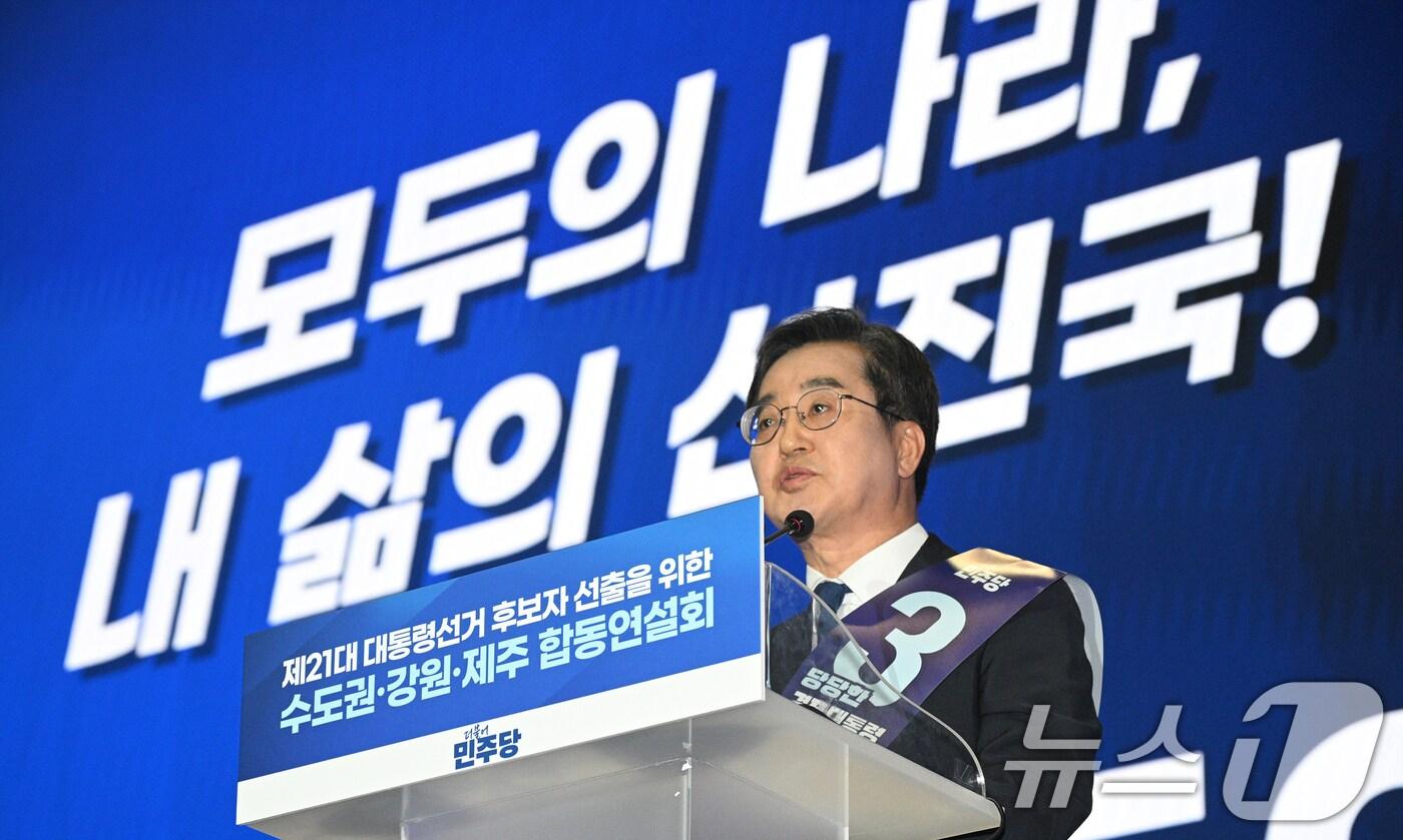김동연 더불어민주당 대선 경선 후보가 27일 경기 고양시 킨텍스에서 열린 수도권·강원·제주 합동연설회에 참석해 정견발표를 하고 있다. (공동취재) 2025.4.27/뉴스1 ⓒ News1 안은나 기자