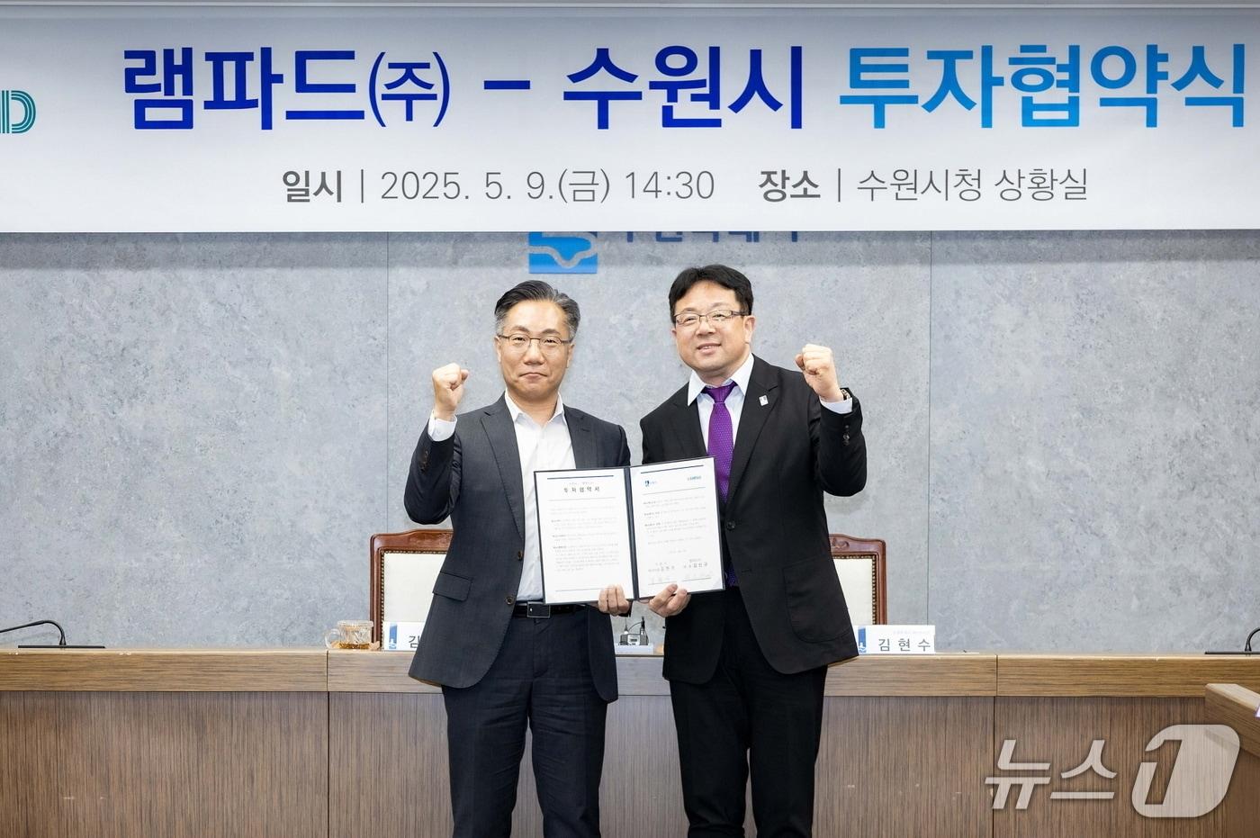 김현수 경기 수원시 제1부시장(오른쪽)이 김신규 램파드㈜ 대표와 민선 8기 12호 투자협약을 맺은 후 기념촬영을 하고 있다. (수원시 제공. 재판매 및 DB 금지) 2025.5.9/뉴스1
