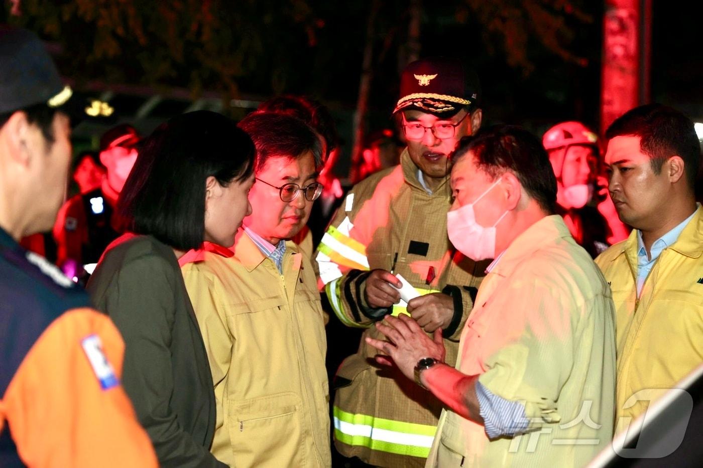 김동연 경기도지사가 17일 광명시 소하동 아파트 화재 현장을 방문해 수습 상황을 전달받고 있다. 앞서 이날 오후 9시 5분께 광명시 소하동 10층짜리 아파트 1층 주차장에서 불이 나 3명이 심정지 상태에 빠졌다.(경기도소방재난본부 제공. 재판매 및 DB 금지)2025.07.18 ⓒ News1 양희문 기자,김기현 기자