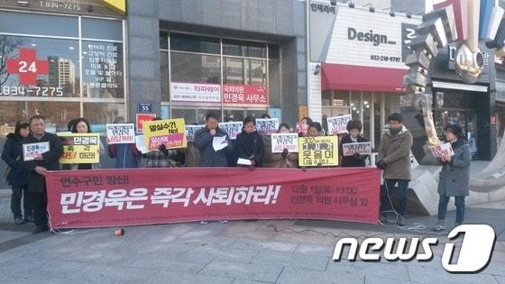 “박 대통령 탄핵 반대·‘세월호 웃음 브리핑’ 책임져야”인천 평화복지연대 등 12개 인천 연수구 지역 시민단체는 1일 인천 연수구 송도동 사무실 앞에서 민경욱 국회의원의 의원직 사퇴 촉구 기자회견을 열었다. (인천평화복지연대 제공) 2016.12.1 ⓒ News1