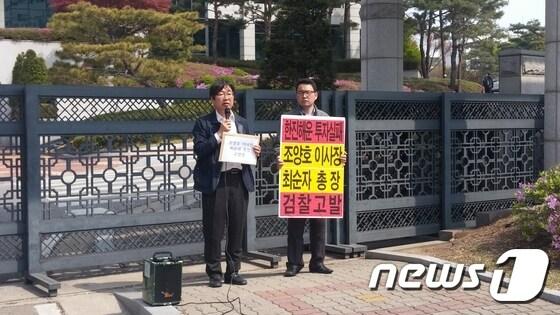 조양호 이사장·최순자 총장 등 4명 배임 혐의신규철 인천평화복지연대 정책위원장이 고발장 제출에 앞서 인천지검 앞에서 기자회견을 하는 모습. 2017.4.18 ⓒ News1 주영민 기자
