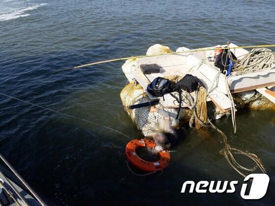 해경이 21일 강화군 석모도 앞바다서 표류하던 70대를 구조하고 있다.ⓒ News1