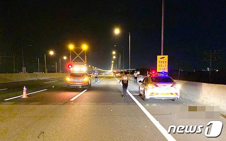 경찰이 차량을 통제하고 흑염소를 구조하고 있다.(독자제공)ⓒ 뉴스1