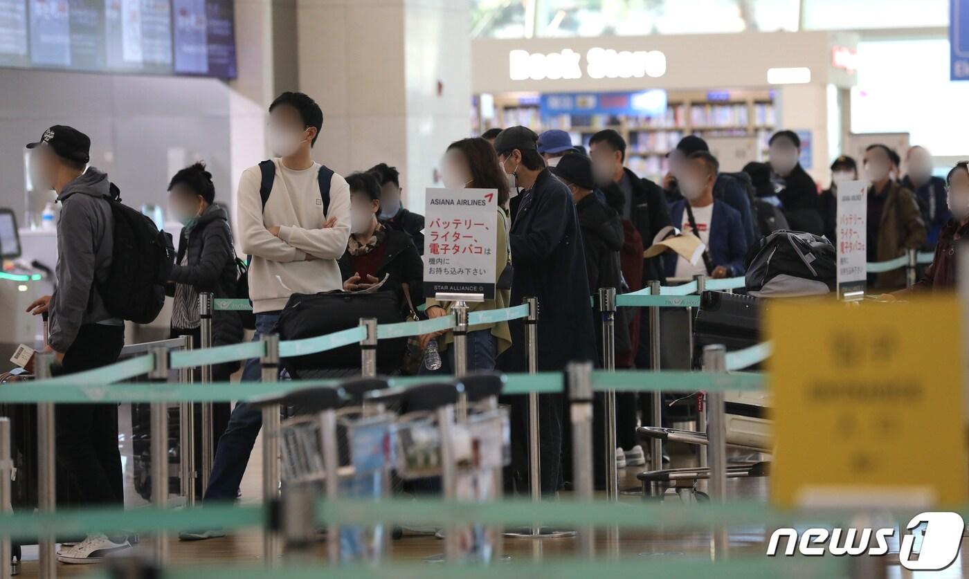 '한일 기업인 특별입국 절차' 시행일인 8일 승객들이 인천 중구 인천국제공항 제1여객터미널 출국장에서 도쿄/나리타 출국 절차를 밟고 있다. 외교부에 따르면 한일 양국은 '한일 기업인 특별입국절차'에 합의했다. 우리 기업인들이 '비즈니스 트랙' 제도를 이용하면, 일본 입국 후 14일 격리 없이 경제활동을 할 수 있다. 2020.10.8/뉴스1 ⓒ News1 정진욱 기자