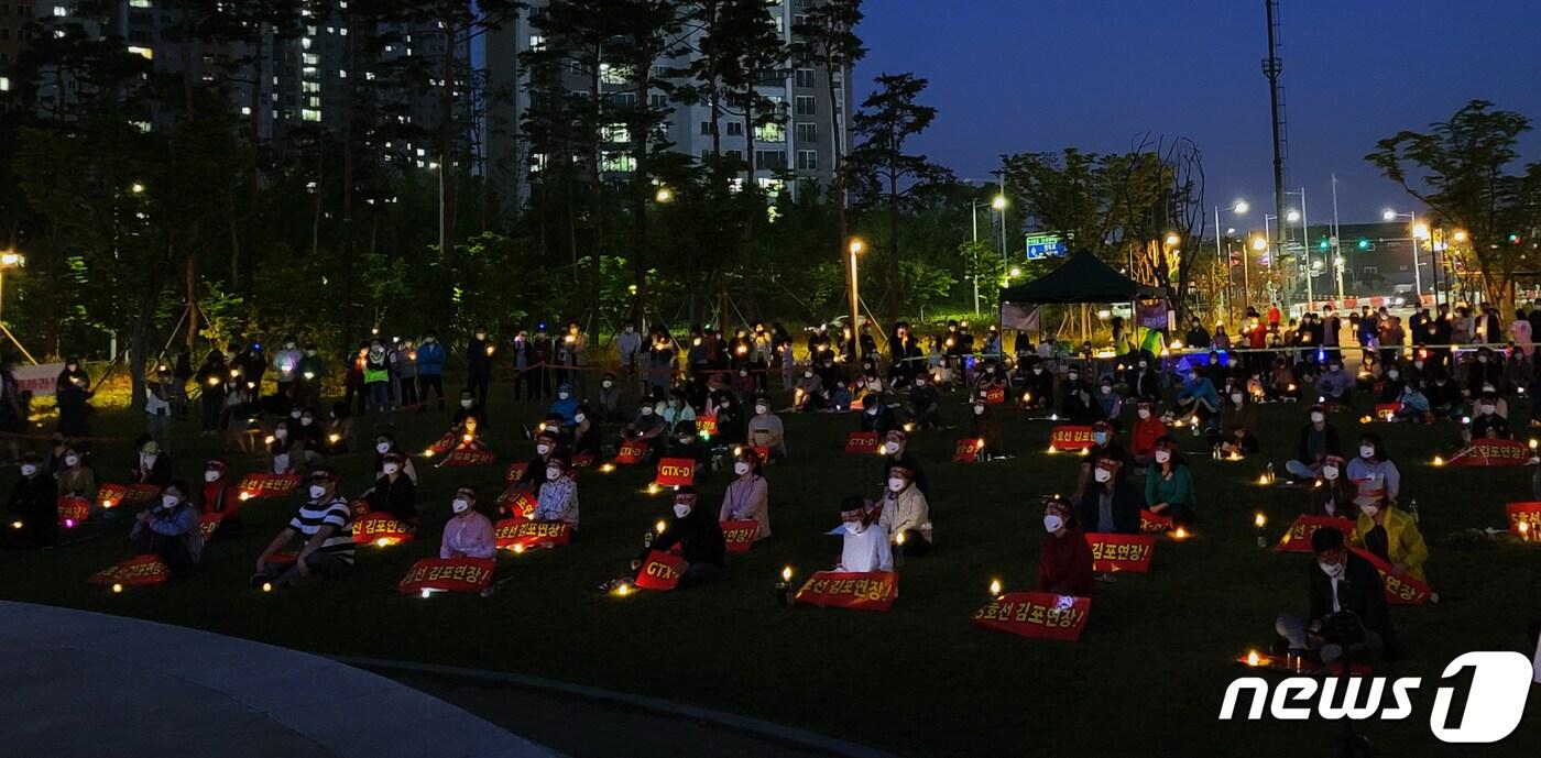 GTX-D원안 및 지하철 5호선 연장을 요구하는 김포·인천 검단 주민들이 5일 김포시 장기동 한강중앙공원에서 촛물문화제를 열고 있다.(김포검단교통시민연대제공) 2021.6.5/뉴스1 ⓒ News1 정진욱 기자관련 키워드김포검단철도GTX지하철5호선서울관련 기사김포골드라인, 인천 검단까지 연장…국토부 계획 승인대우건설, 김포 '풍무역 푸르지오 더 마크' 10월 분양김포 집값, 교통·대출 규제에 '이중 부담'…반등은 아직 [르포]GTX-D 마중물 '광역급행철도' 예타 통과…검단서 서울역까지 20분대(종합)"김포-서울 30분 시대, 눈앞"…'서부권 광역급행철도' 예타 통과