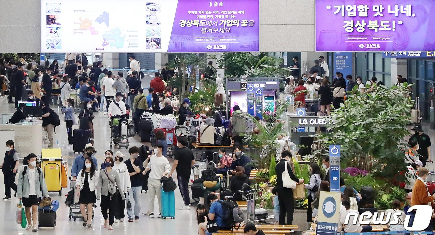 개천절까지 이어지는 연휴 둘째 날인 2일 인천국제공항 제1여객터미널 입국장이 해외 여행객들로 붐비고 있다. 2022.10.2/뉴스1 ⓒ News1 민경석 기자관련 키워드코로나19인천공항PCR해제인천