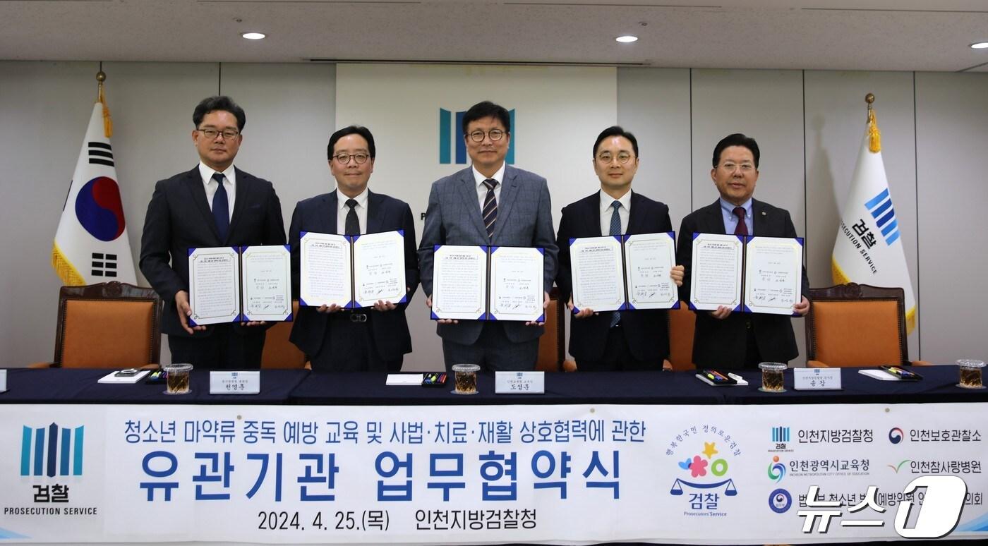 25일 인천지검에서 도성훈 인천시교육감(가운데)이 인천지방검찰청, 인천보호관찰소, 인천참사랑병원, 법무부 청소년 범죄예방위원 인천지역협의회 관계자들과 함께 청소년 마약범죄 근절 및 건강한 사회문화 조성을 위한 업무협약을 체결한 후 기념사진을 찍고 있다.(인천시교육청 제공)2024.4.25박소영 기자 "왜 너만 싸게 팔아"…흉기로 이웃상인 위협 소래포구 상인 송치유정복 인천시장과 함께 '선거법' 재판받는 공무원 4급 승진 임용