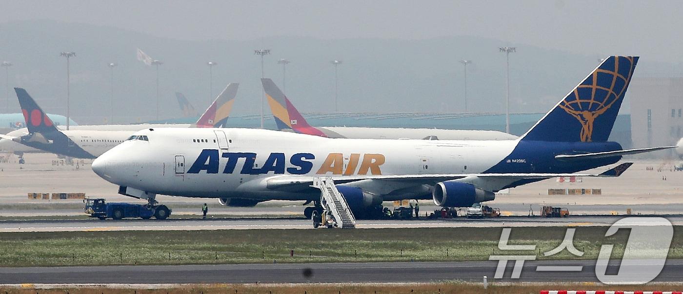 11일 인천공항 활주로에서 정비 관계자들이 타이어 파열로 멈춰 선 아틀라스 항공 화물기를 살펴보고 있다. 2024.6.11/뉴스1 ⓒ News1 이승배 기자