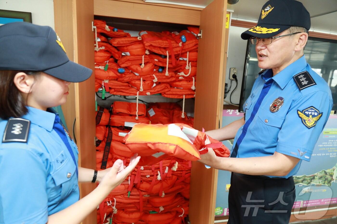 구명조끼를 점검하는 김용진 중부지방해양경찰청장(사진 오른쪽)/뉴스1